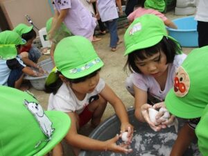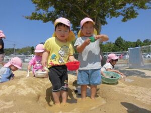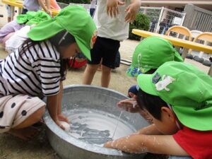 暑さに体が慣れる前に、夏がやって来ましたね。6月は予想外の青空の元、外でたくさんの体験が出来ました!自然の中でいろいろな感触を全身で楽しんだみんな♪その表情が、楽しさを表していますよね。友だちと一緒にすることで、楽しさも倍増!「みせて!みせて!」「いっしょにしよ~!」「おしえてあげる~!」嬉しい声が沢山聞こえた6月でした。暑い夏も、みんなで面白いこと見つけていこうね!