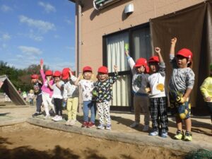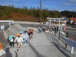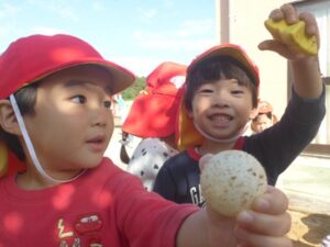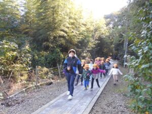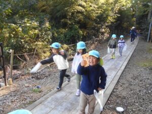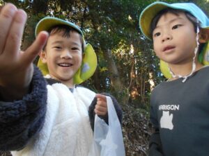 今日は秋晴れ!きりん組さんとぞう組さんが、歩いて20分ほどの場所にある照床神社にお散歩に行きました。どんぐりやしいのみ、落ち葉などなど、秋がくれた宝物をたくさん見つけて大喜びのみんなでした。照床神社にある大きな滑り台にも挑戦しました。おしりが真っ黒になるほど滑って楽しんでいましたよ。