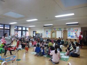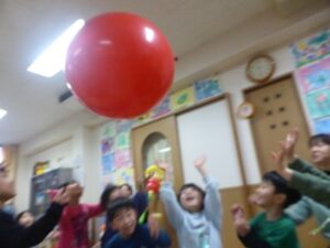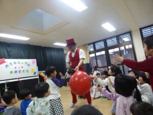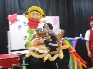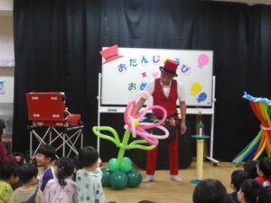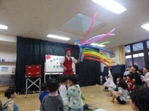 さと原人さんの手の中で、いろいろな形に変わっていくバルーンに興味津々の子どもたち。「なにができるのかな?」次から次へと変わっていくバルーンに、大喜びのみんなでした。かわいいバルーンや、弓矢になって飛んでいくバルーン、大きいバルーンに、長ーいバルーン、着れちゃうバルーンまで!!とっても楽しい時間になりましたよ。さと原人さん、ありがとう!