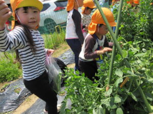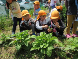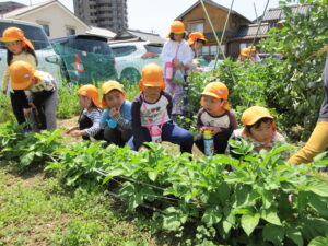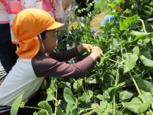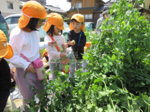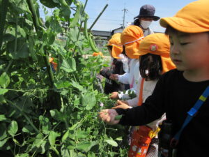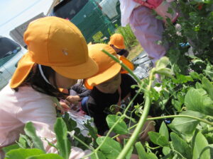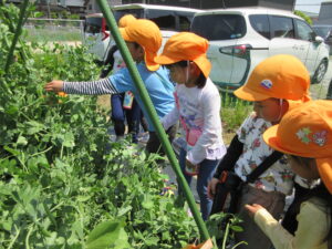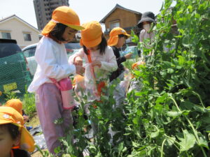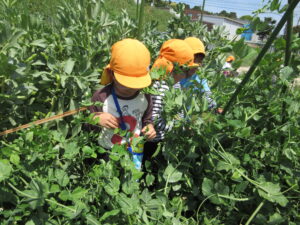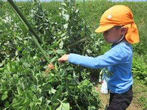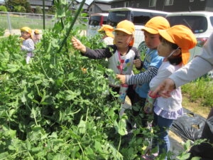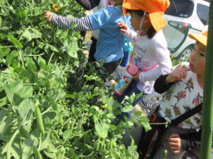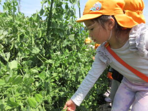 とねり公園へのお散歩に行った帰り道…ぞう組さんは畑に寄ってスナップえんどうの収穫をしました。採っても採ってもお豆がどんどん見つかって、「ここにもある~」「ここにもあったよ~!」と大収穫でした☆
