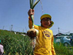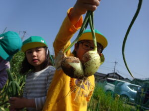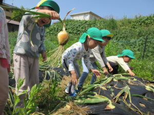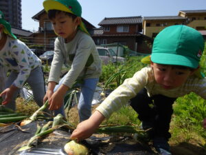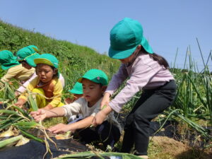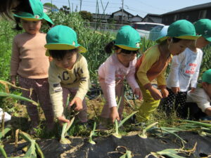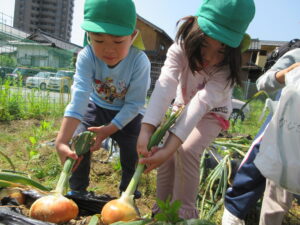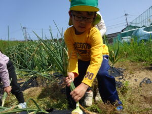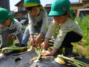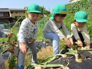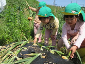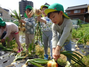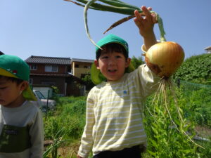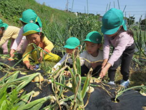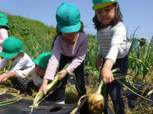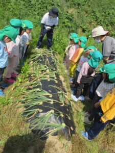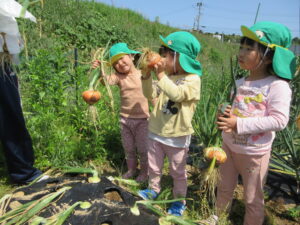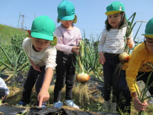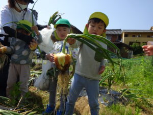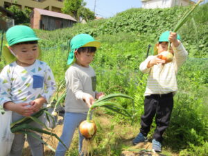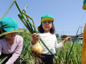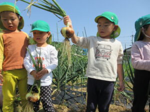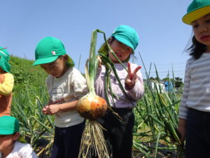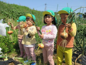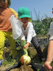 2023.05.17 玉ねぎ収穫☆きりん組(5/17) 今日は畑に行き、玉ねぎの収穫をしました。玉ねぎからなが~い根っこが伸びていて、ひっぱってもひっぱってもなかなか動かない玉ねぎさん。精一杯の力を込めて、収穫を楽しみました。大きな玉ねぎ、赤ちゃん玉ねぎ、ハートの形の玉ねぎ…♡色々な形の玉ねぎがありました。食べるのも楽しみにしている子どもたちです。 「玉ねぎ、とるぞ~!」 ハートみたい…♡ とれた~! とれました!ピース♡ 「あっ、カメムシだ!」 < 前の記事へ | 次の記事へ >