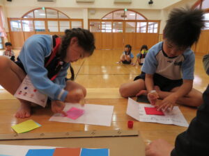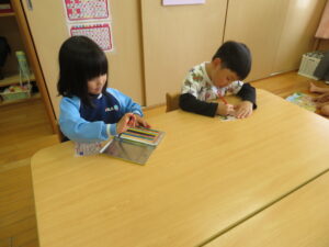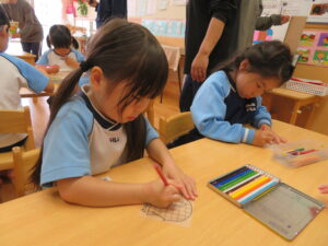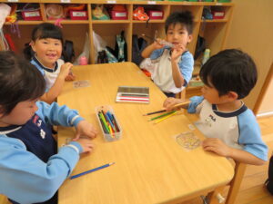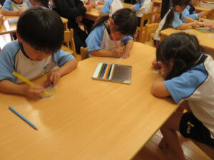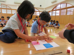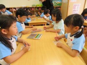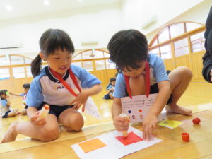 3つのミッションをクリアし、見事、宝箱を見つけたぞう組さん!中に入っていたのは、色画用紙と鍵。みんなで厚紙に画用紙を貼っていくと…カラフルなエルマーが完成しました。エルマーと記念撮影をした後、もうひとつの宝箱が…さっき見つけた鍵で宝箱を開けるとエルマー柄のプラ板が入っていました♡部屋に帰って、色塗りを楽しみ自分色のエルマーが完成!焼いてもらって記念のキーホルダーにします☆
