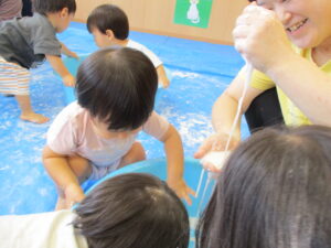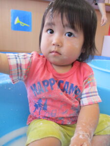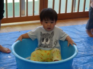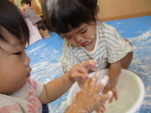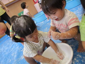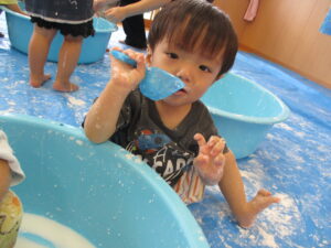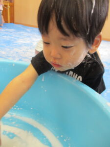 片栗粉で遊んだ時の様子です。はじめに粉を触ってみます。さらさら、きゅっきゅとしていて、手が真っ白け。「みてみて~」と友だちや先生と気持ちを伝え合います。水を入れると…とろ~ん。「わぁ~!」「とろとろ~」何度も何度も手ですくっては、手からこぼれていく片栗粉を不思議そうにながめていましたよ。色々な感触を味わいながら遊び、子どもたちも担任もとっても楽しそうでした。またしようね(^-^)
