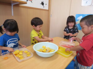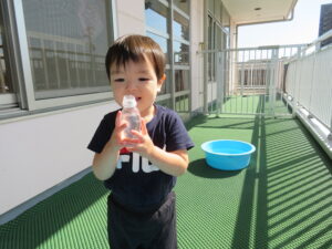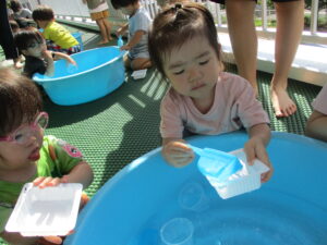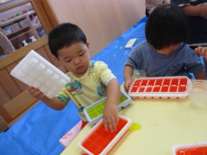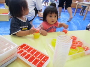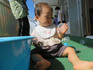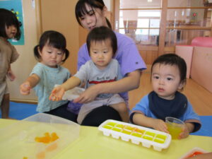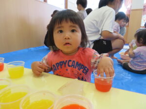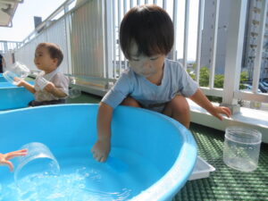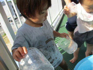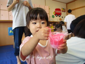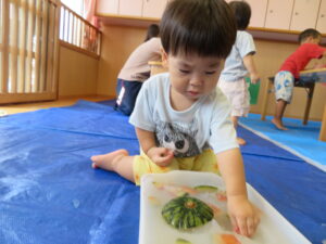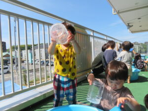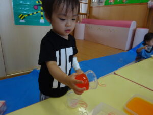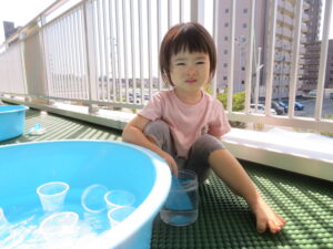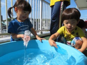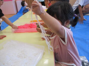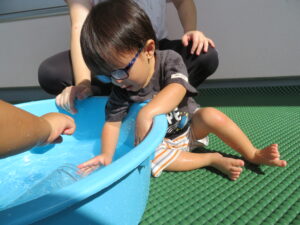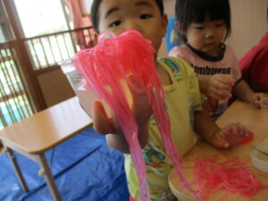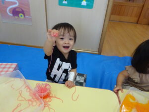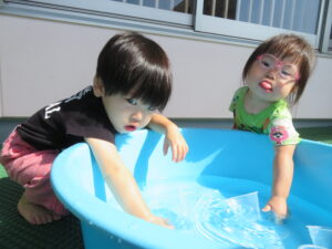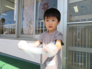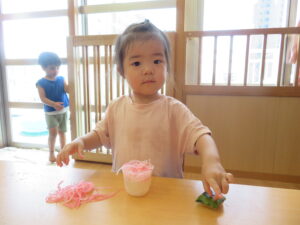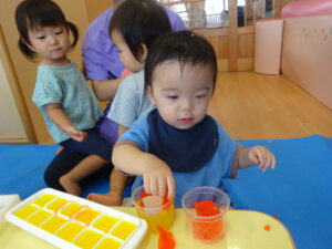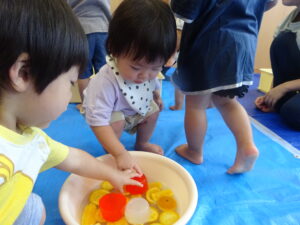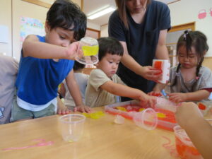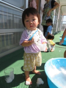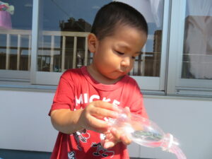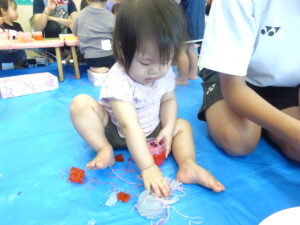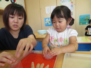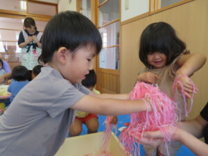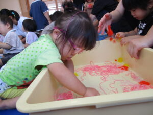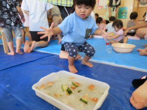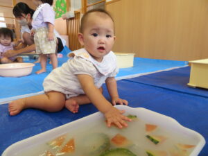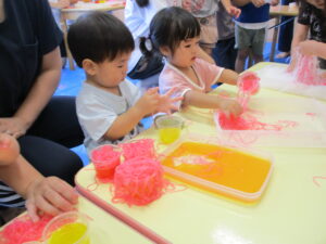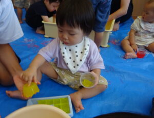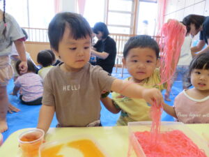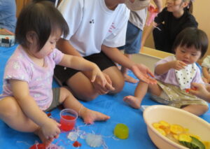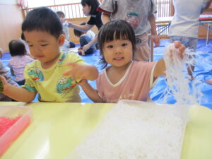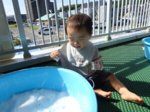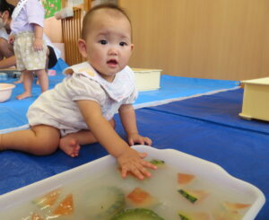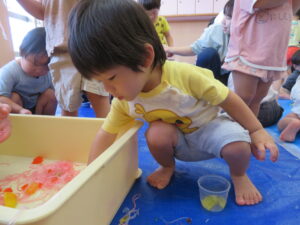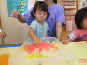 9月のある日。この日は感触遊びDAY☆前日に先生たちが作った寒天やはるさめを使って遊びました。久しぶりに気温が上がり、テラスでは水遊びと泡遊びもしましたよ。好きな素材を自分でえらんで、じっくり触れて遊ぶことができました(^-^)楽しかったね、また、しようね。職場体験で来てくれている中学生のお姉さんも一緒に遊んでくれましたよ♡