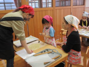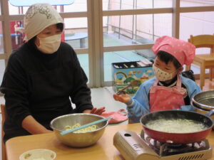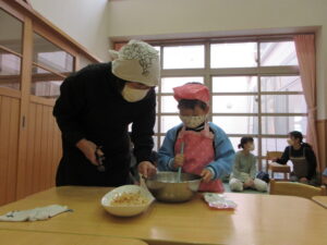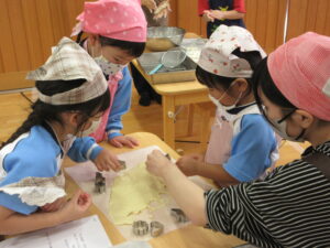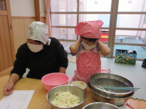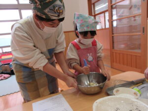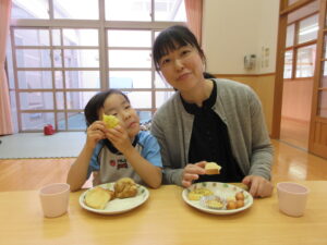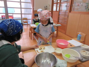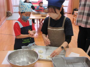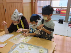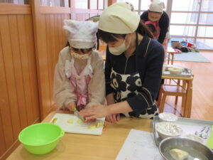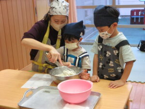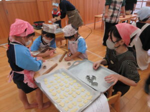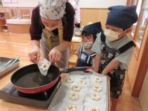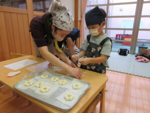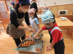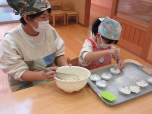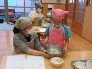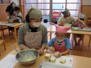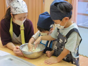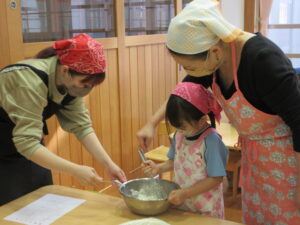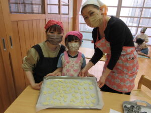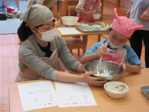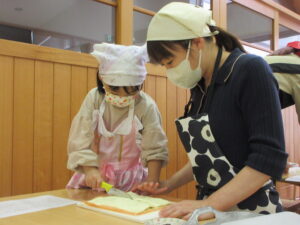 10月28日(土)に10組の親子に参加してもらい、親子おやつクッキングを行いました。保育園で人気の手作りおやつを親子で作ろう!ということで、この日のメニューは「クッキー」「ポンデリング風ドーナツ」「うどんかりんとう」「さつま芋・ミルク蒸しパン」「バナナケーキ」「揚げパン・メロンパン風トースト」です。