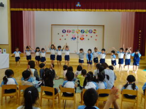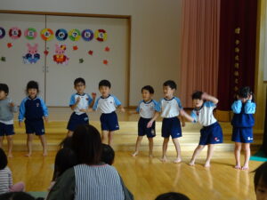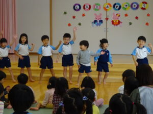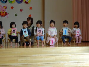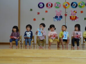 今日は、うさぎ組さんのひも落としお祝い会をしました。名前を呼ばれたらステージに出ていき少しドキドキのうさぎ組さんでしたが、みんなにおめでとう!とお祝いしてもらい、プレゼントももらって、とっても嬉しそうでしたよ。みのり黒田保育園のお友だちも、み~んな今日まで元気に大きくなってくれて、ありがとう(^-^)と感じたお祝い会でした。