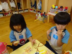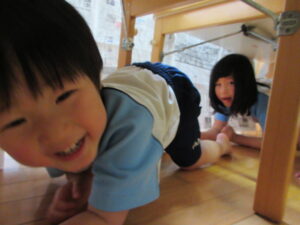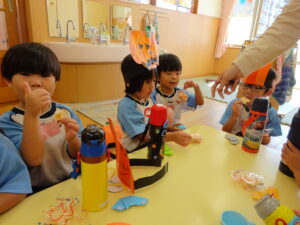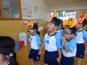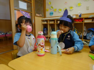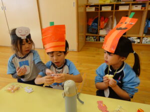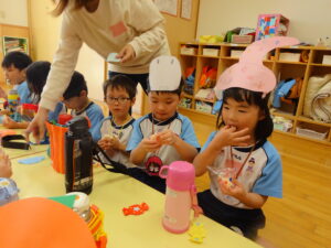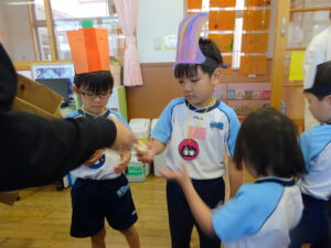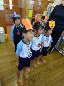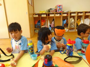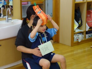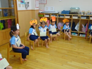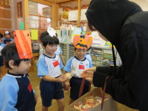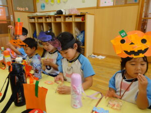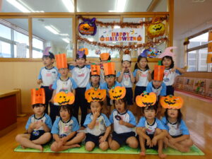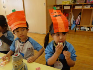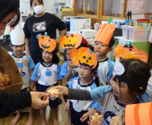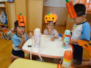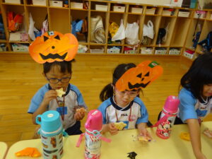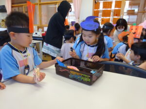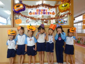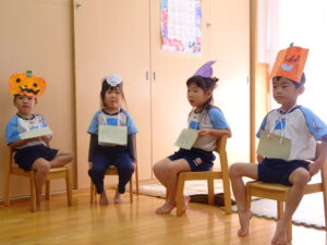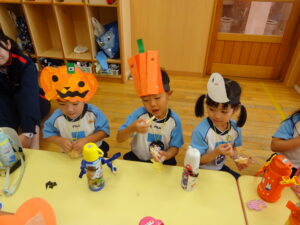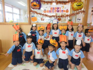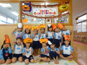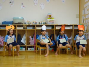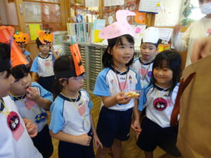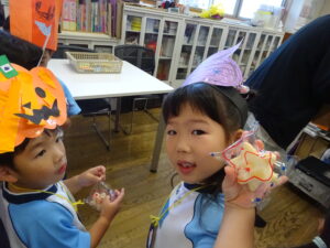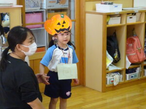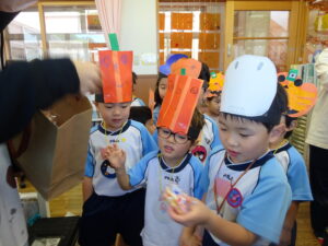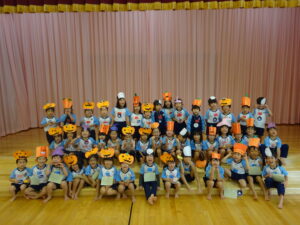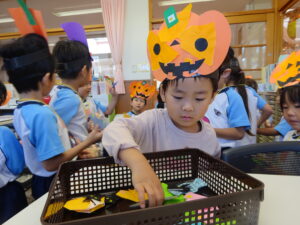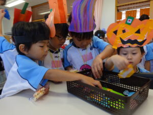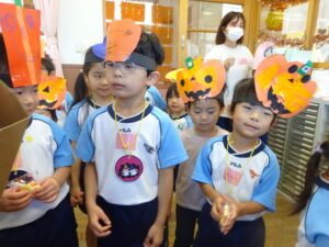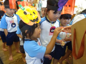 2023.11.10 ハロウィンパーティー🎃幼児部(10/30) この日は幼児部さんでハロウィンパーティー☆3グループに分かれて色々なお楽しみを探して園内を歩きました。新聞紙迷路のあるサーキット遊び、フルーツバスケットならぬハロウィンバスケット、映えスポットで写真撮影、そして…魔女のお部屋に行き「トリックオアトリート」言えるかな? ハロウィンの由来を聞きます。 「トリックオアトリート!!」 新聞紙迷路だ~ どんどん進むぞ~ < 前の記事へ | 次の記事へ >