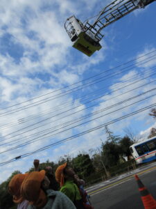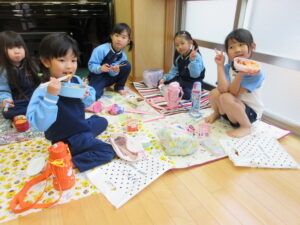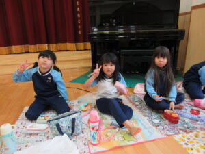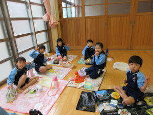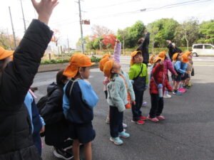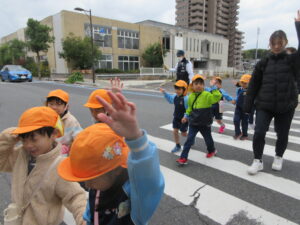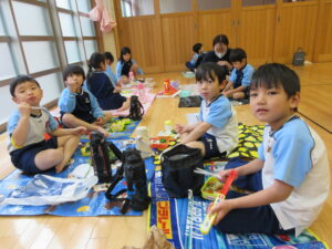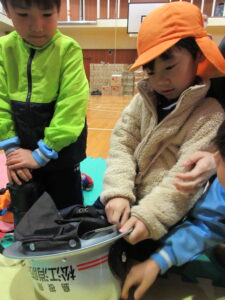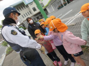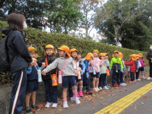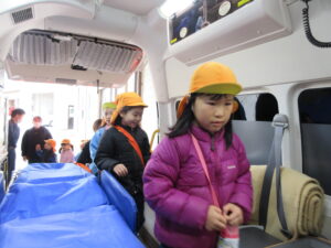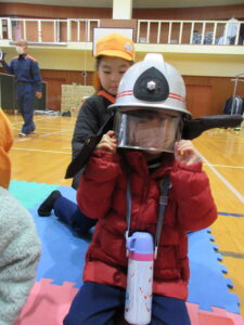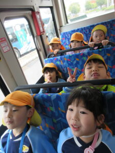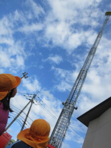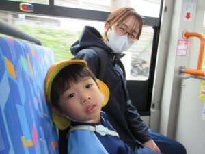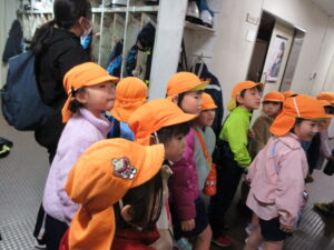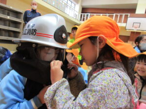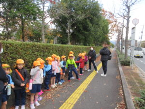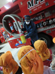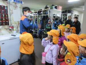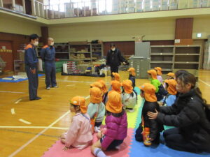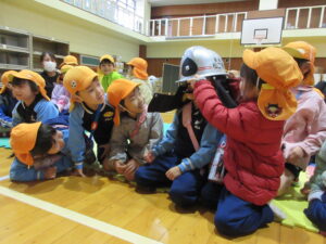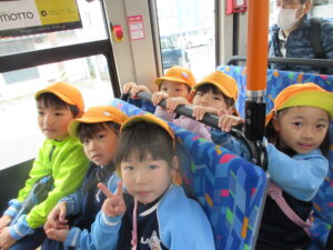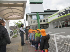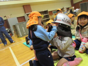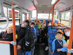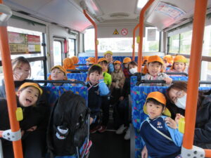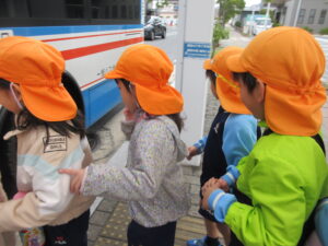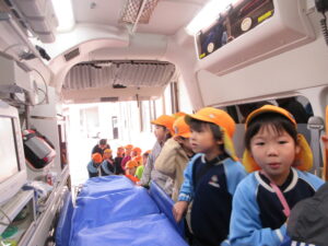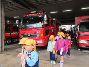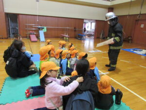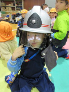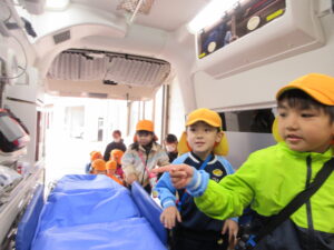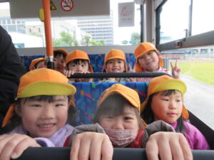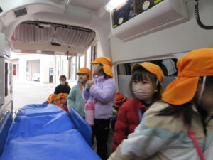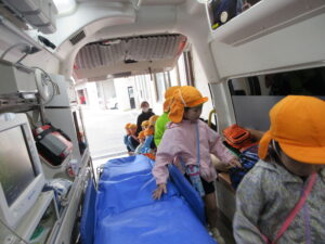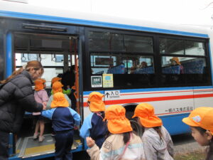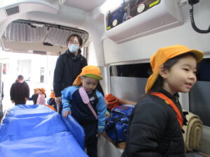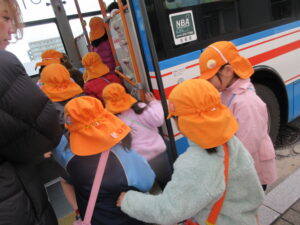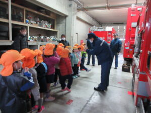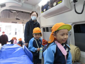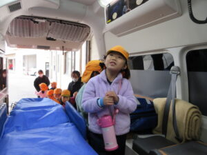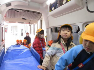 この日は路線バスに乗って消防署までお出かけです。交通安全教室でお世話になった比津交番のおまわりさんが、バス停まで見守りをしてくださいました。無事にバスに乗ることができ、消防署到着!消防署では、消防士さんのお話を聞いたり、ヘルメットをかぶらせてもらったり、救急車に乗せてもらったり、はしご車をぐ~~~~んと伸ばしてもらったり、貴重な体験をさせてもらいました。寒い日だったので、園に帰って楽しみにしていたお弁当を食べました(^-^)