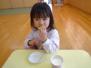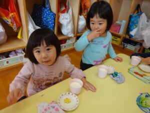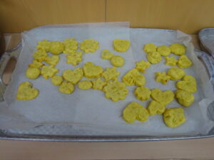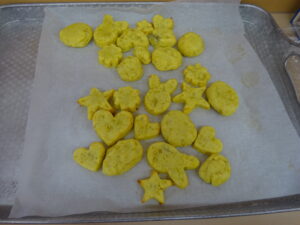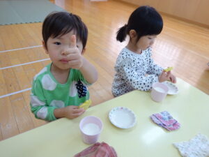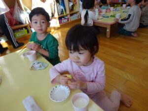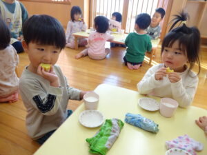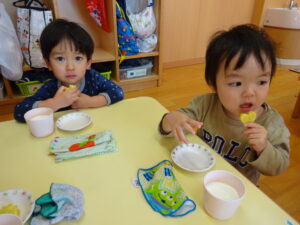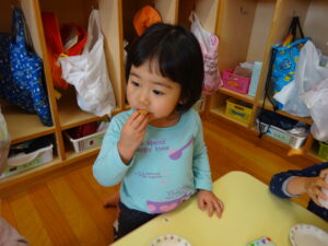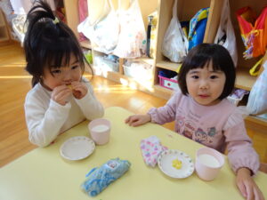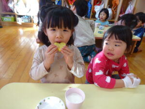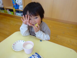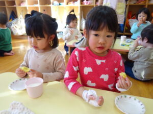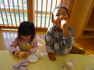 2023.12.26 スイートポテト完成☆うさぎ組(12/26) 午前中、みんなで型抜きして作ったおいもさん🍠みんながお昼寝をしている間に…給食先生がオーブンで焼いてくれましたよ☆とってもおいしそうにできました(^-^)自分たちで作ったので、いつも以上に美味しかったね(^-^)また、クッキングしようね。 じゃ~ん!完成です! とってもいいにおいがしています☆ < 前の記事へ | 次の記事へ >