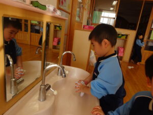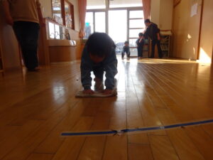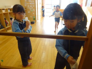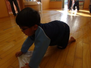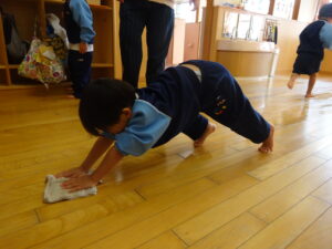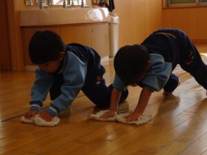 今日は保育納めの日。こあら組さん、きりん組さんも大掃除をしていました。雑巾がけもなかなか上手でしたよ。