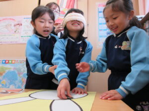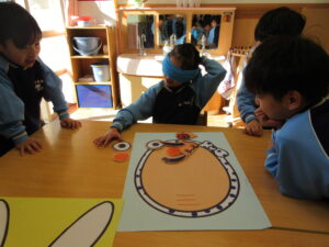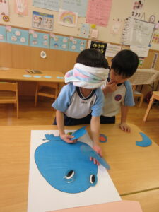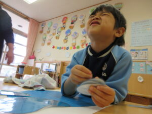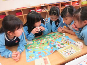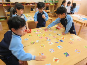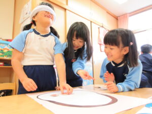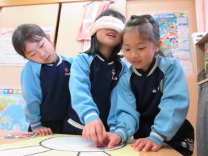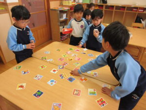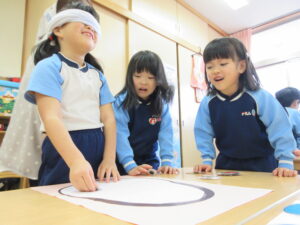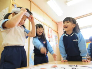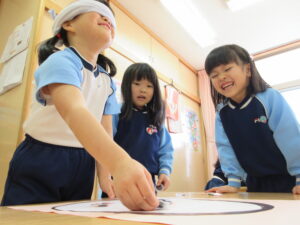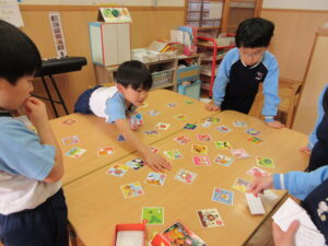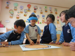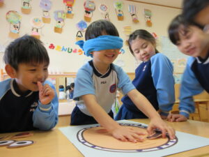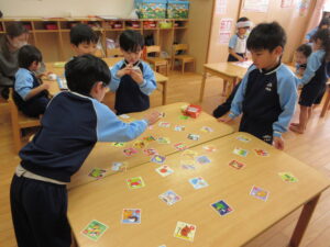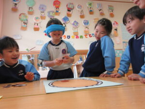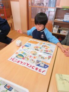 2024.01.09 お正月遊び☆ぞう組(1/5) 保育はじめの会で園長先生からお正月遊びのお話を聞きました。昨年遊んだことを覚えている子もいましたよ。そして…お部屋に戻るとさっそく遊んでいました(^-^)先生たち手作りの福笑い!カルタ、すごろく…福笑いはまわりのみんながヒントを出してくれます。「そこそこ!」「もうちょっとみぎ!」など。顔ができあがるたびに大笑い☆カルタは読み手も取る方も真剣です。お正月ならではの遊びをじっくり楽しみたいです。 < 前の記事へ | 次の記事へ >