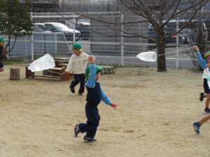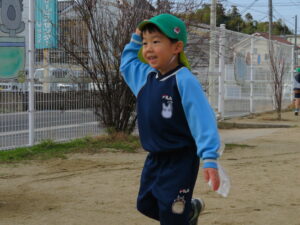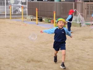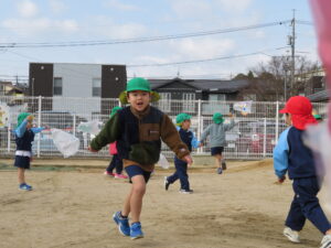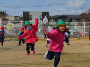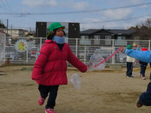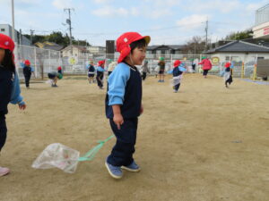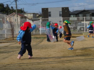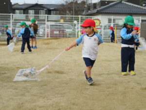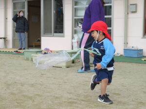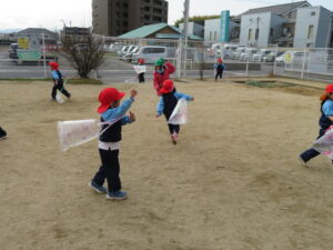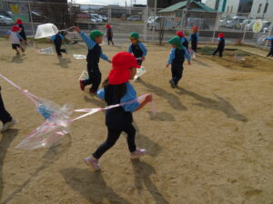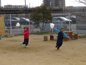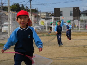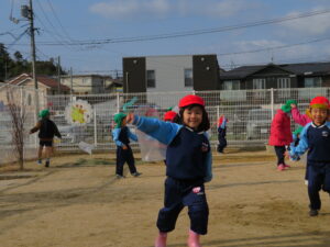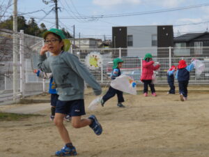 自分で作った凧を持って園庭に集合!みんなで凧あげです!た~こ、た~こ、あ~がれ(^-^)