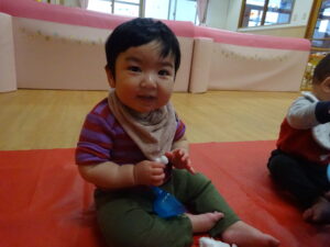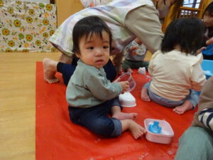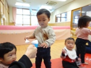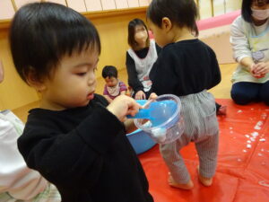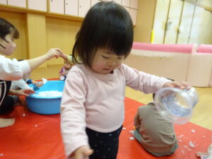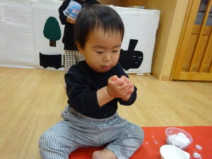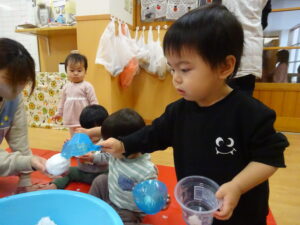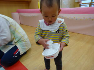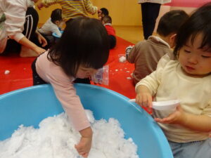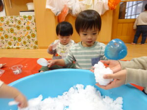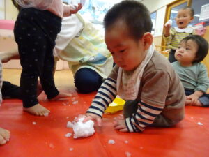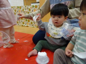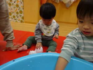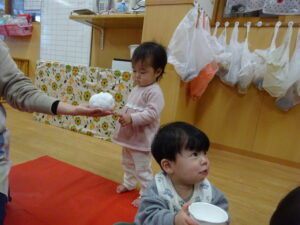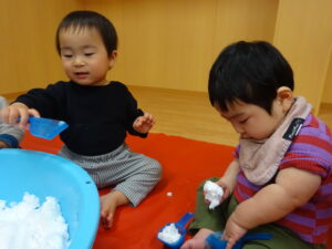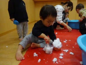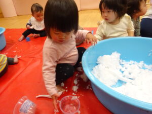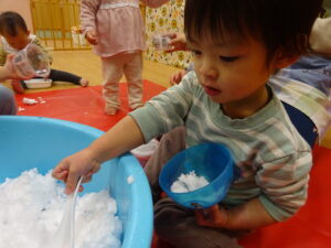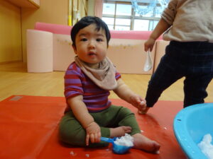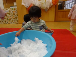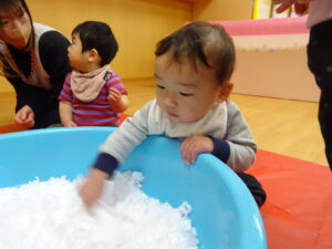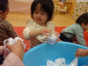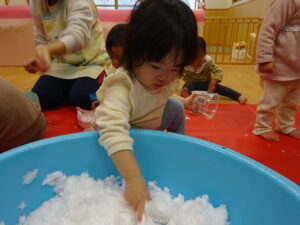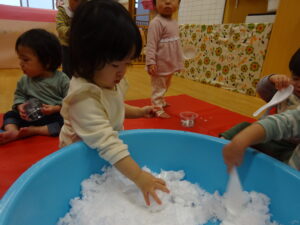 雪が積もった今日。ひよこ組さんはお部屋で雪遊び♪保育者に雪を見せてもらったり、たらいに入った雪をスプーンですくったり、慣れてくると手で触ってみるお友達もいましたよ(^-^)