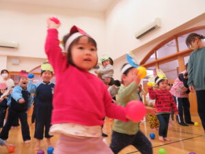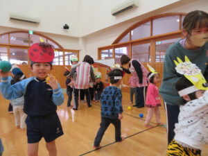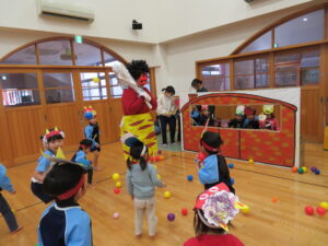 今日は豆まき会がありました。先生たちの劇「ピーマンマンのまめまき」を見て、自分の心の中にはどんなおにがいるかな~と考えてみました。今日、保育園にやってきたのは「ねぼすけおに」でした。大きな声で「おには~そと~!」とボールでおに退治しましたよ。自分の心の中のおにも退治できるくらいみんなで頑張りました。頑張った後はおいしい給食。今日は赤おにライス、おにオンスープ、おに退治サラダでした。おやつには恵方巻ロールを食べて、今年も元気に過ごせそうです(^-^)