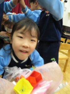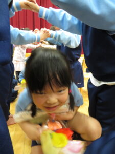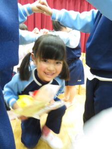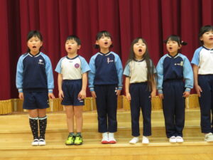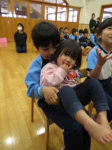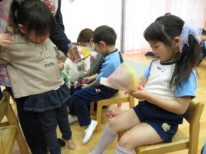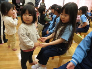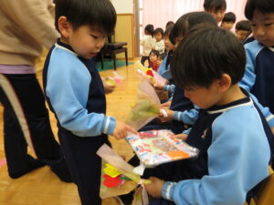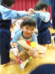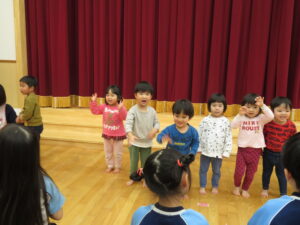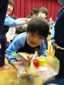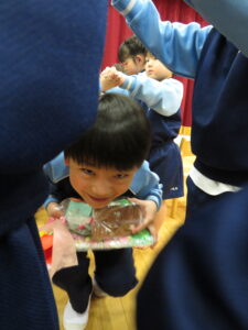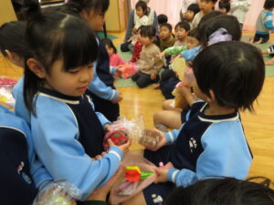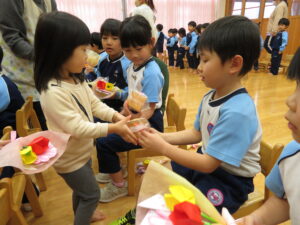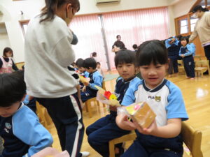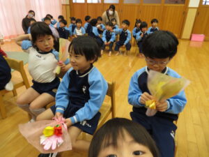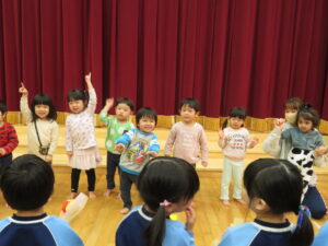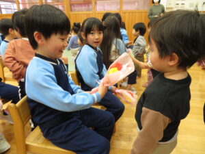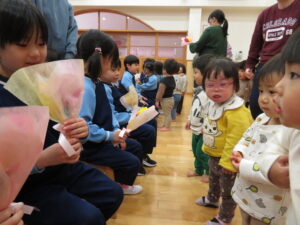 今日はお別れ会がありました。3月で保育園を育了するぞう組さん。一緒に手をつないで散歩に行ったり、お部屋に手遊びや紙芝居を読みに来てくれたり、一緒にダンスを踊ったり、お店屋さんごっこで遊んだり…思い出がいっぱいです☆そんなぞう組さんにみんなからたくさんのありがとうを伝えました♡歌をうたったり、一生懸命作ったプレゼントを渡したりしました。ぞう組さん嬉しそうでしたね!先生たちも一生懸命覚えたダンスで精一杯のありがとうを伝えました~☆残りわずかな保育園生活、もっともっと一緒に遊ぼうね(^-^)