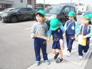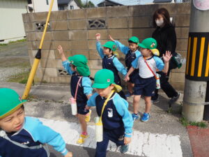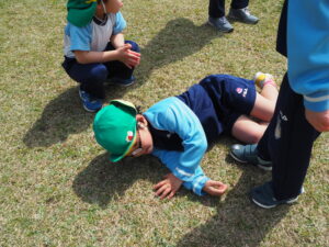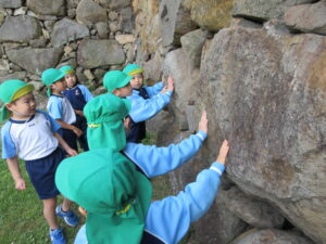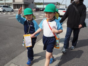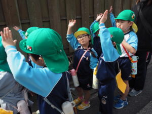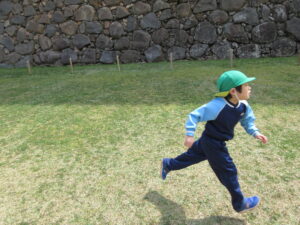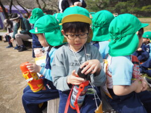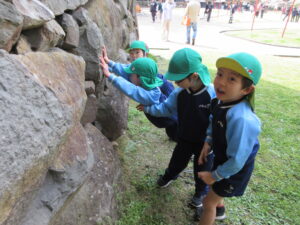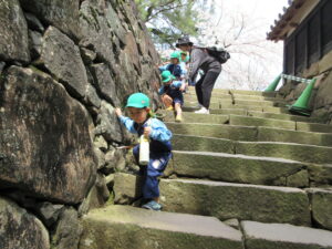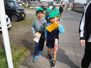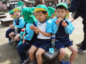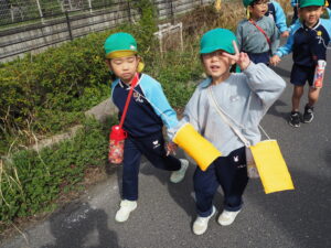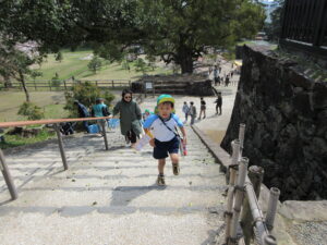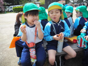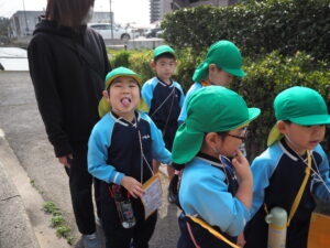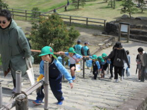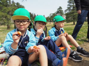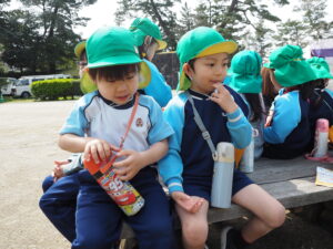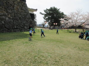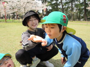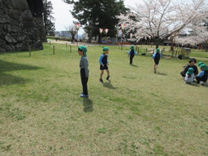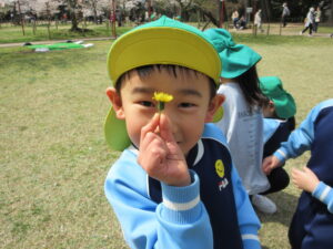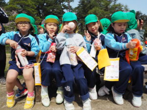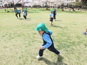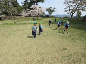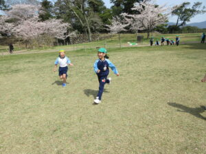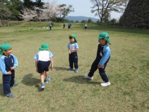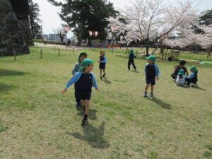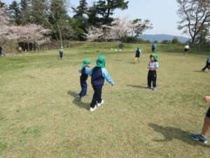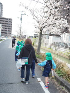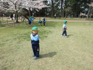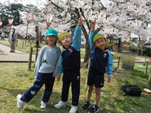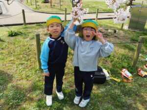 今日は良いお天気になりました(^-^)満開の桜を見に、城山までお散歩に出かけましたよ。「まだ~?」「もう着く?」「あとどれくらい?」と言いながら、頑張って歩きました。桜を見たり、芝生の広場で走り回ったり、お楽しみのおやつタイムもあり…楽しいひとときを過ごしました☆