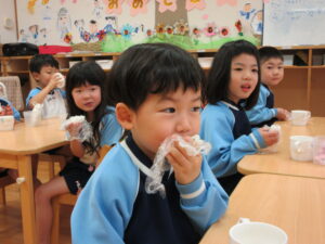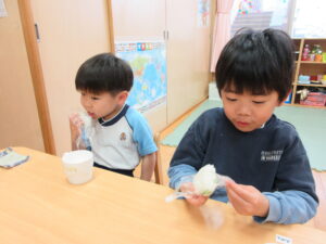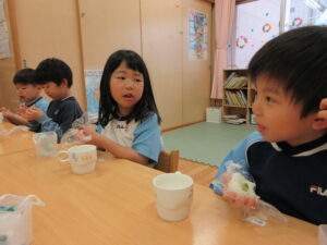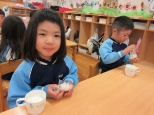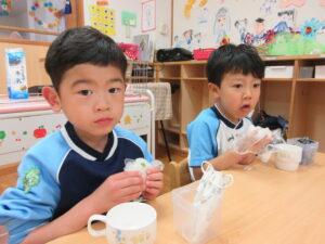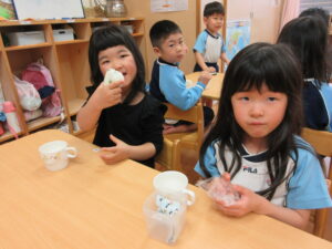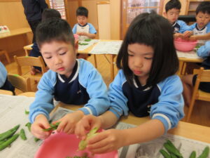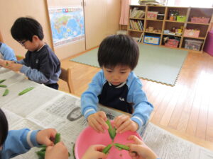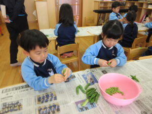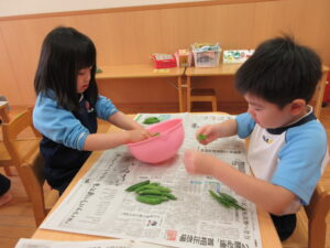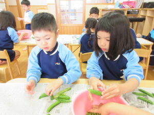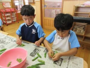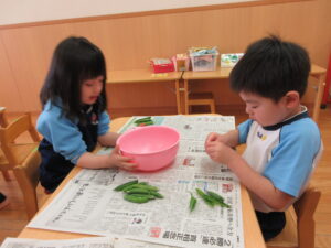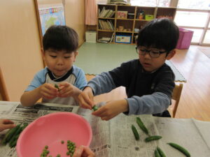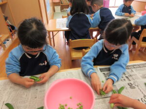 今日のおやつはピースおにぎり🍙おやつに使うグリンピースのさやだしをぞう組さんがお手伝いしてくれました。おやつの時間には「これ、ぞうさんがしたやつだよね~」「いろんなお豆さんがあったよね」とお友だちとお話しながら嬉しそうに食べていましたよ。お豆のいいにおいがして、春の味がするおにぎりで、今日は春をたくさん感じることができました!