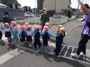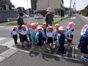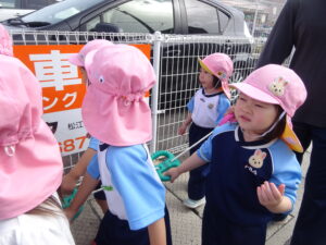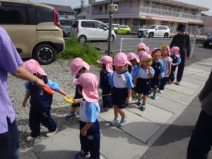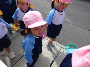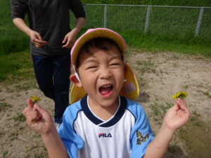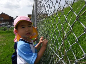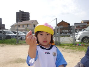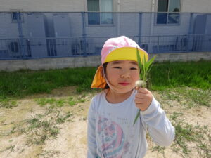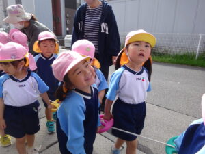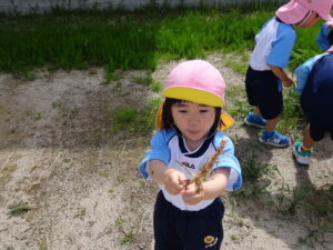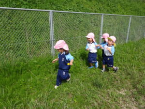 こあらさんになって初めてのお散歩♪お散歩ロープをしっかりと握って歩き、第2園庭まで行きました。道路を渡る時はしっかりと手をあげて渡ることができましたよ(^-^)第2園庭はお花や草がいっぱい生えていたり、ヘリコプターがお空を飛んでいたり…暖かい春(少し暑いくらいでしたね(^_^;))を感じながら遊びました。