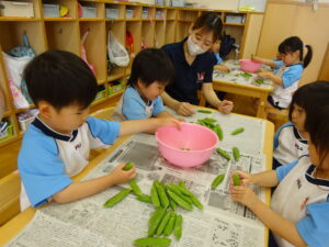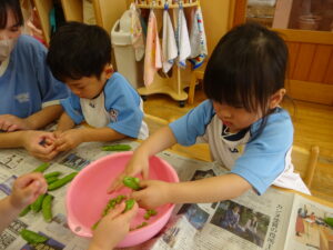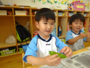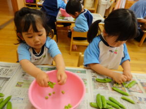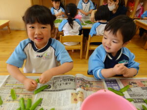 今日は給食先生のお手伝いで、グリンピースのさや出しをしました。給食先生にやり方を教えてもらい、さっそく挑戦!初めは力をいれてもなかなか”さや”が開かずお豆さんが見えてこなかった子も、保育者や給食先生と一緒にやっているうちにだんだんとコツをつかんでできるようになっていましたよ。明日の給食で豆ごはんにしてもらう予定です。楽しみだね(^-^)