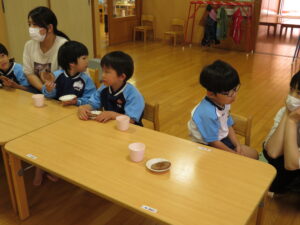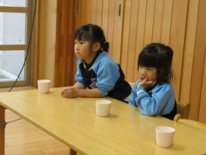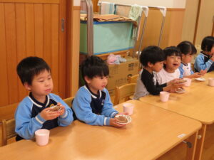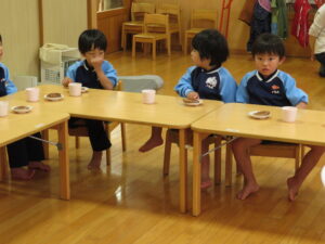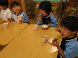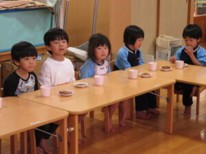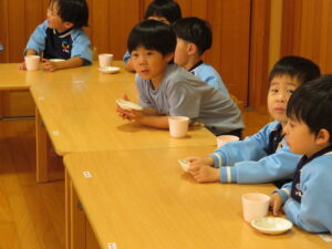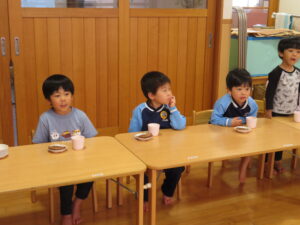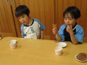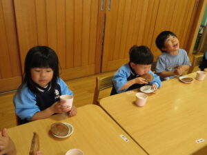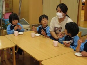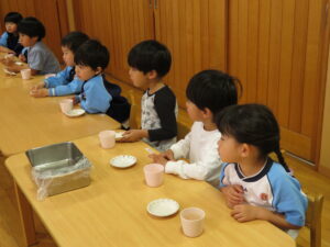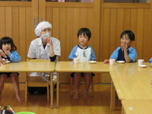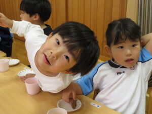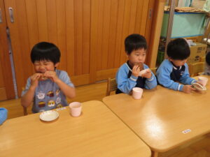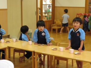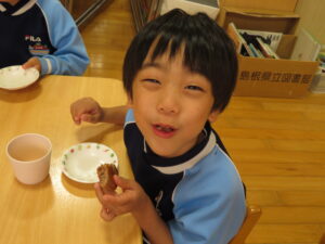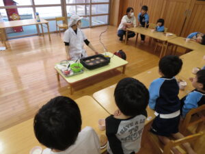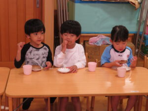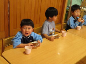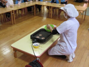 今日のおやつはホットケーキ!給食先生がみんなの前でおかわり用のホットケーキを焼いてくれました☆だんだんいいにおいがしてきて、耳を澄ませると「ジュ~ジュ~」という音も聞こえてきましたよ。ホールに、いいにおいがいっぱいになっていました。おいしかったね。給食先生、ありがとう(^-^)