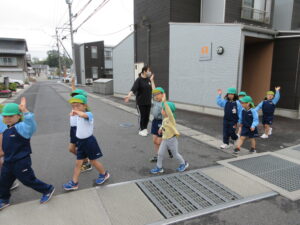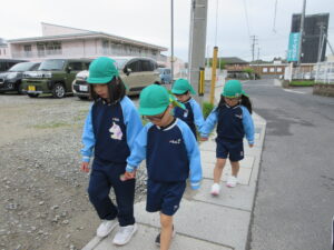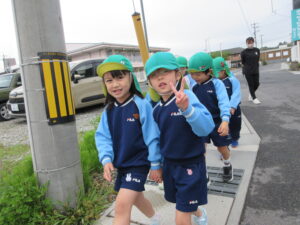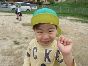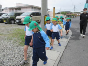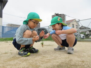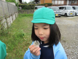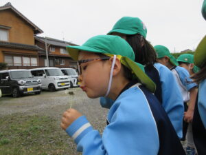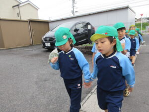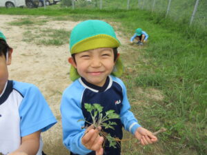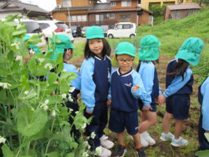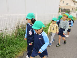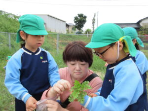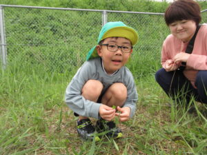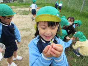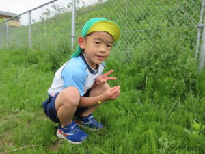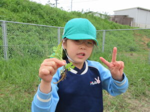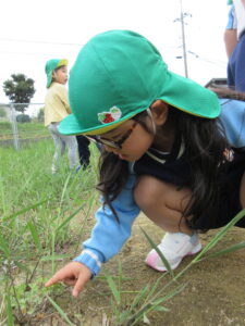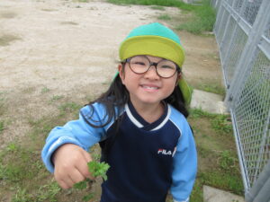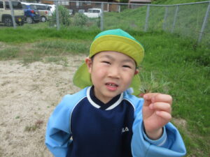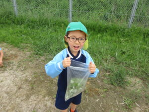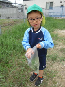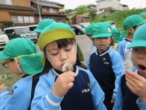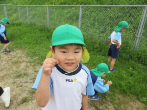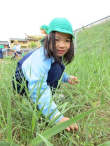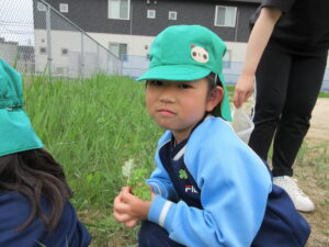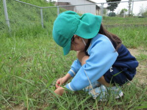 よもぎ団子を作ろう!ということで…この日は第2園庭へよもぎ摘みに行きました。先生からのお話を聞いて、やわらかそうな葉っぱを摘んでいきます。ついでに隣の畑の様子も見に行き、スナップエンドウや玉ねぎの生長を見て帰りました。