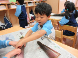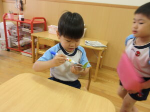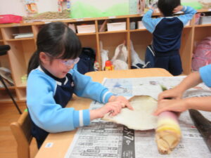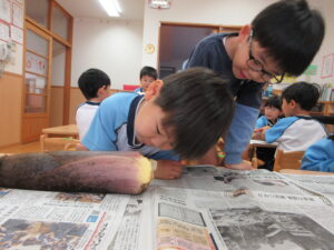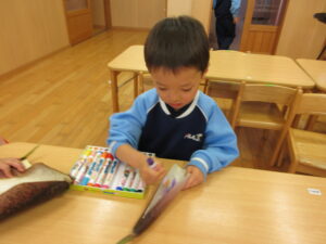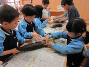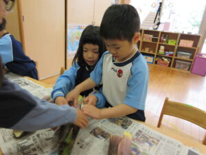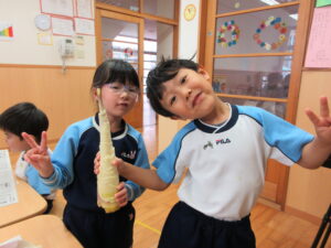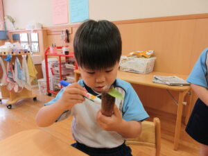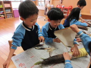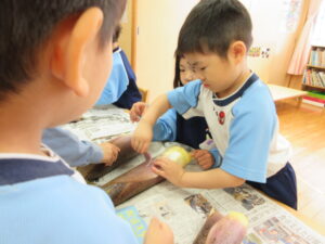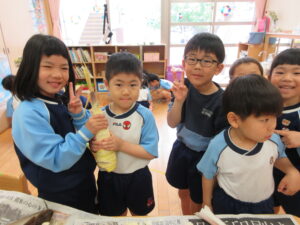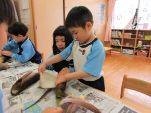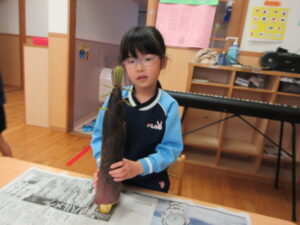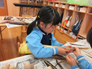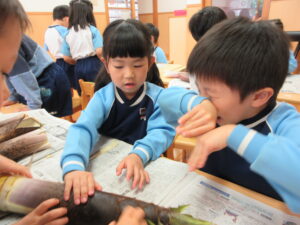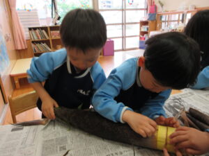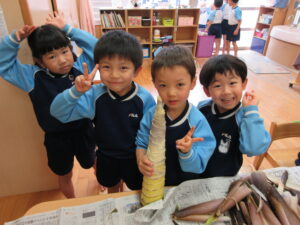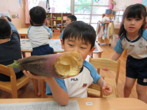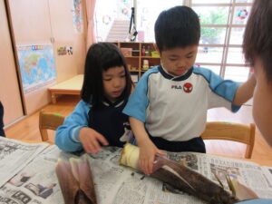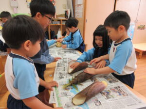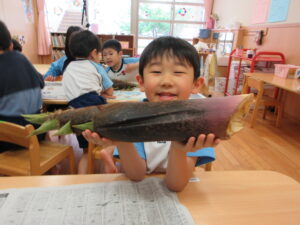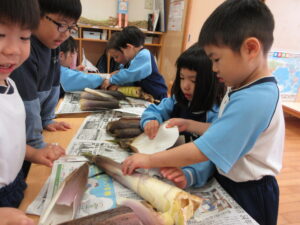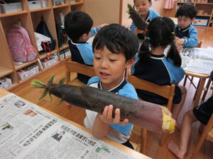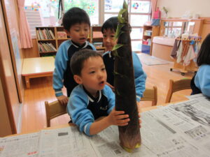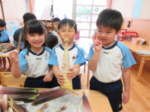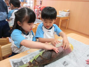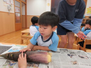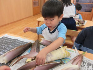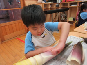 みのり黒田保育園の先生がお家のお山から掘ってきてくれた「たけのこ」。ぞう組さんも皮をむいてみました!皮の感触や、たけのこのにおいをかぎながら、たくさんの春を感じた時間でした。皮にお絵かきできるかな…と絵を描いてみる子もいましたよ。何でも「やってみよう」の気持ちでやってみるとおもしろい発見がありますね(^-^)