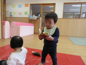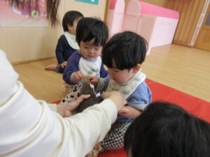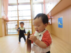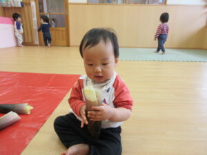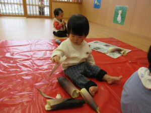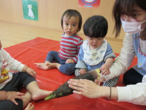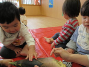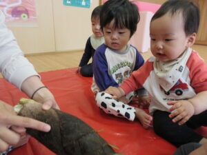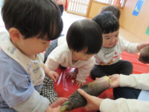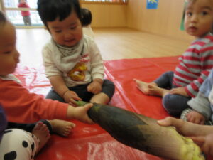 みのり黒田保育園の先生のお家のお山で採れた「たけのこ」があひる組さんにもやってきました。子どもたちは何だろう?と興味津々です。保育者が皮をむくのをじーっと見たり、触ってみたり。春に触れることができました(^-^)