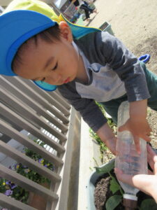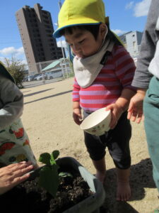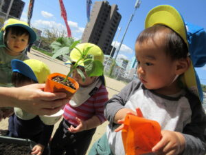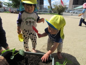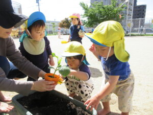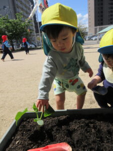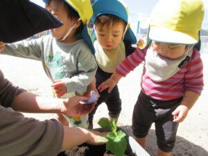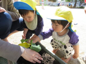 2024.05.17 夏野菜を植えたよ☆あひる組(5/9) 保育者と一緒にきゅうりを植えました。苗や土に触れてみたり、お水やりをしたりしました。きゅうりさん🥒できるの楽しみだね(^-^) < 前の記事へ | 次の記事へ >