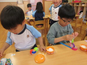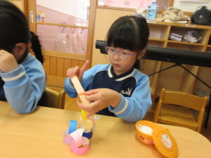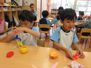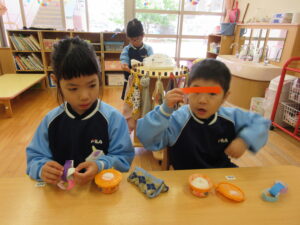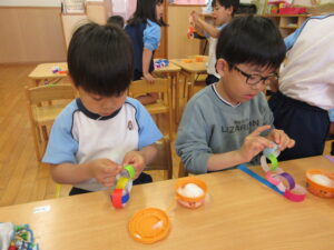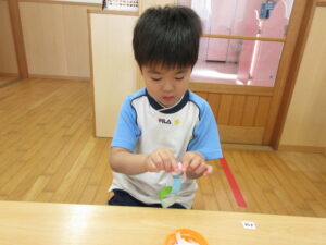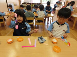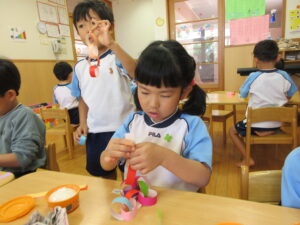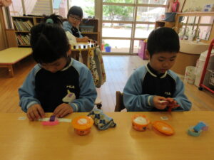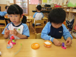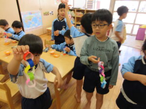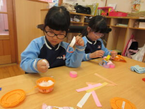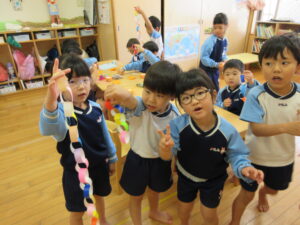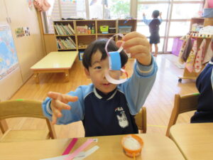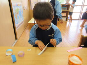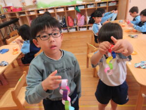 ぞう組さん、保育室でなにやら作っています。輪かざりです(^-^)指先につけるのりの量を調節したり、貼り付ける場所を考えたり…どんどんつなげるためには、穴に次の折り紙を通してから貼り付けないといけなかったり。大人にとって簡単に見える作業でも、子どもたちは色々と考えたり工夫したりしながら真剣です。