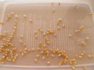2024.05.11 やってみよう!!バケツ稲作り①ぞう組 バケツ稲作りをやってみよう!ということで…まずは『芽出し』です。種もみを水にひたして白い芽が出るのを待ちます。種もみに酸素が十分にいきわたるよう、水は毎日取り替えます。5/7に水にひたし始めて、今日で5日目。よ~く見ると白い芽が出てきているのが分かりますか?来週には種まきができそうです☆ < 前の記事へ | 次の記事へ >