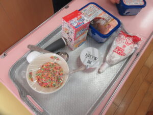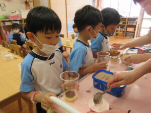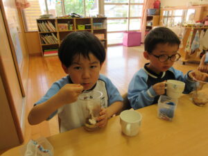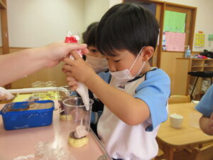 お昼寝をして、元気を取り戻したぞう組さん🐘午後のおやつは『プリン・ア・ラ・モード』です🍮プリンの上に好きな味のアイスとホイップクリームを乗せ、最後にカラースプレーをかけて完成☆おいしい時間となりました。