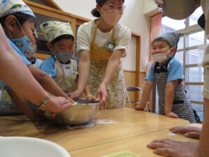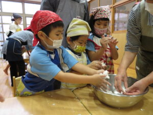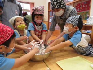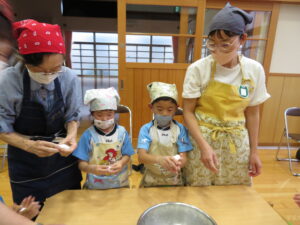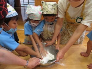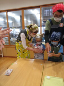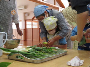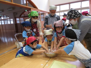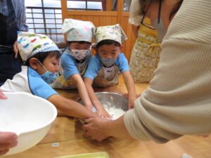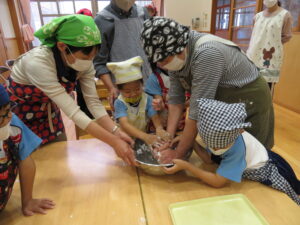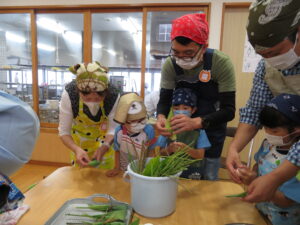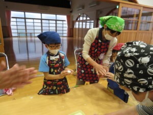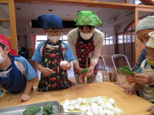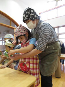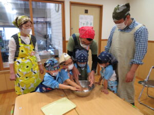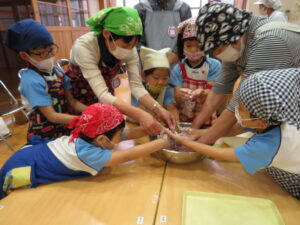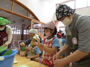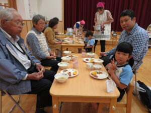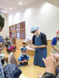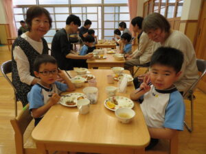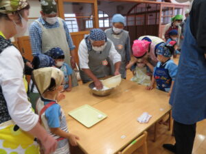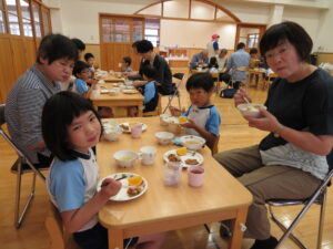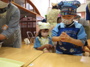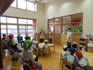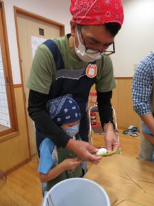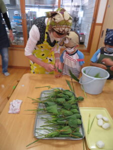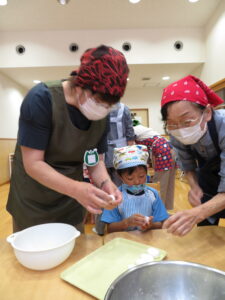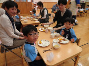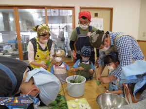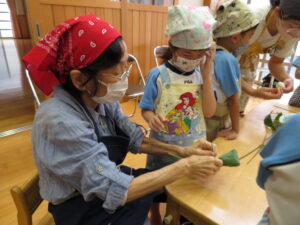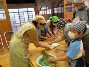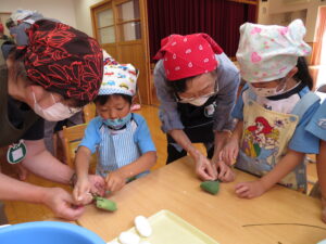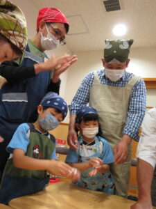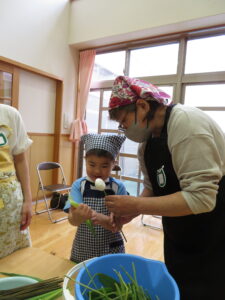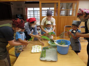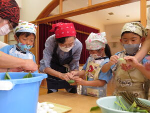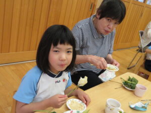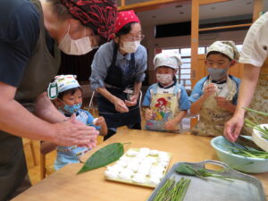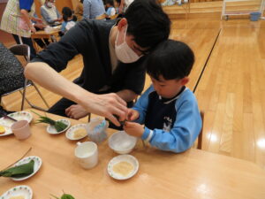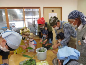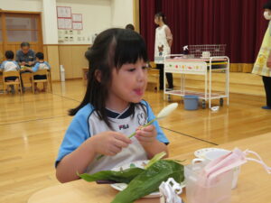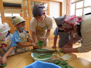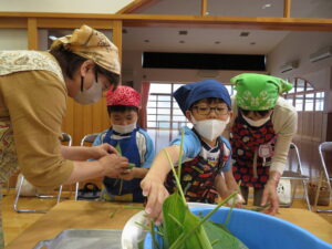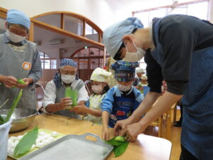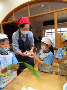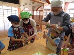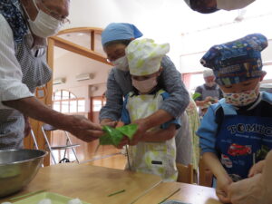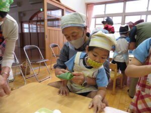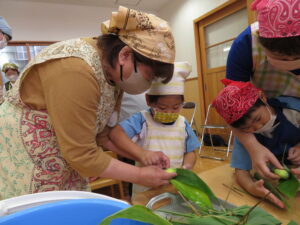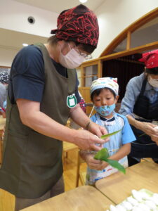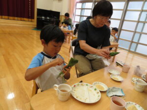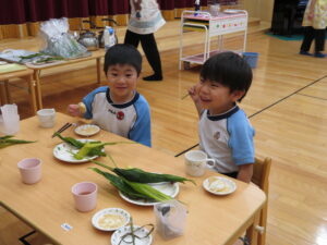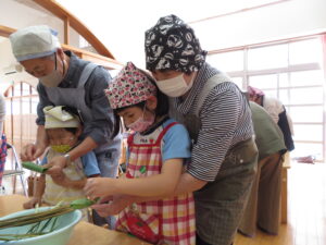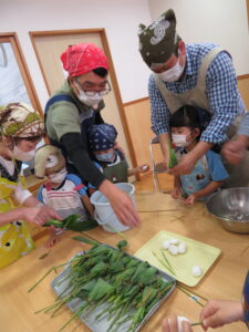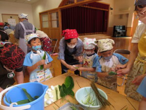 今日はおじいちゃんおばあちゃんと一緒に笹巻き作りをしました。おじいちゃんおばあちゃんが保育園に来てくれることが嬉しくて、今日をとっても楽しみにしていたぞう組さん。少し難しいところも手伝ってもらいながら作っていきました。お歌のプレゼントをしたり、一緒に給食を食べたり、できたての笹巻きも一緒に食べました(^-^)と~ってもおいしかったね。お忙しい中、ご参加いただき、ありがとうございました。
