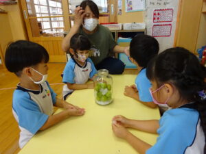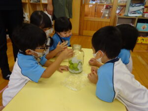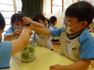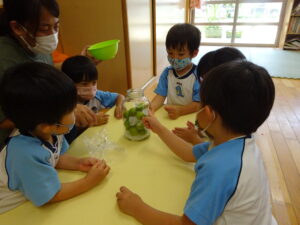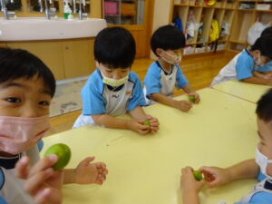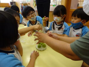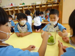 梅ジュースを作りました。つまようじを握り、梅のおへそをよ~くねらって取っていきます。そして、氷砂糖と一緒に瓶の中へ入れていきます。おいしい梅ジュースができるかな??