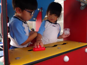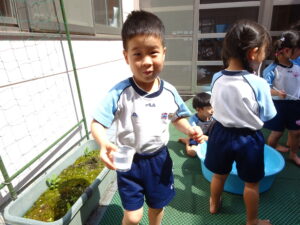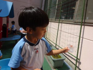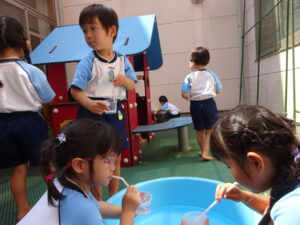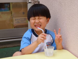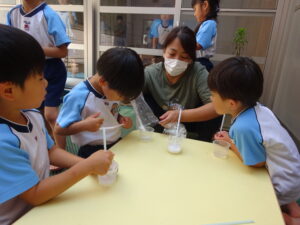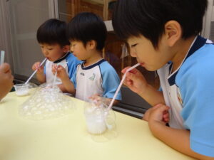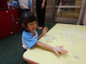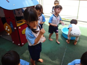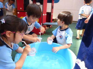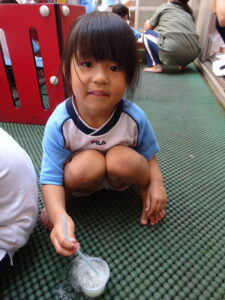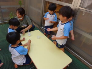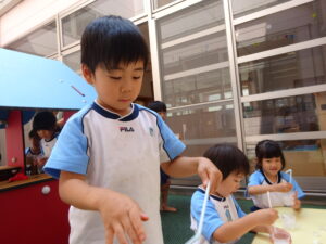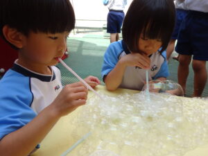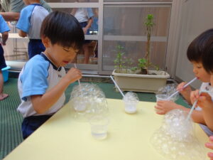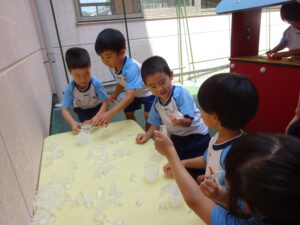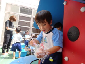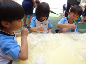 2024.06.11 光の庭で…☆きりん組(6/11) 今日は気温も上がって暑くなりましたね。光の庭で泡や氷で遊んでいたきりん組さんです。ストローを使ってブクブク…たくさん泡を立てて「見て~」と嬉しそうでした。光の庭が石けんのいい匂いでいっぱいになりました☆ 冷たくてきもちいい~ 光の庭にはお家もあるよ。 泡だらけ~~~ 泡がたくさん!! たのしいね~ < 前の記事へ | 次の記事へ >