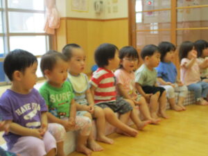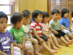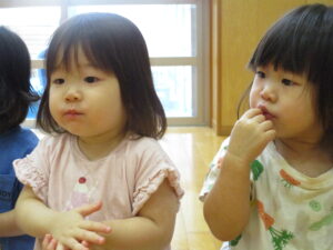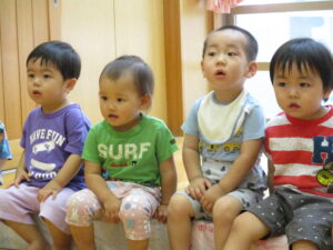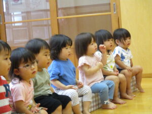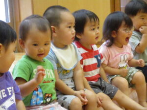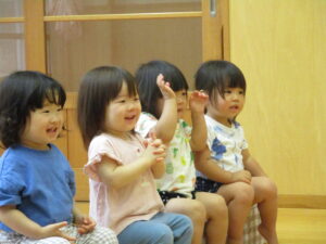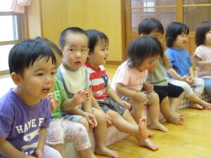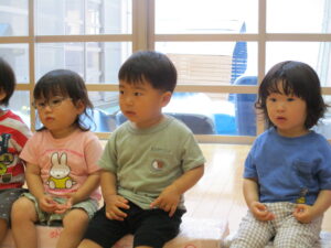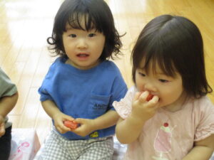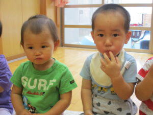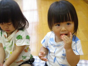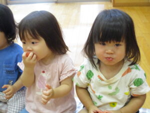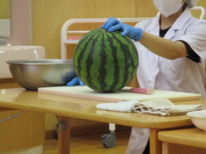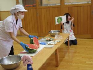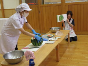 今日の給食の果物は…今年初のすいかさん🍉りす組さんが、給食先生にすいかさんの解体ショーを見せてもらっていましたよ。絵本で見ているすいかさんと同じ!みんな、めをまんまるくしたり、両手をあげて喜んだりしながら、興味津々で見ていましたよ。その場でひと口、味見もさせてもらい、おいしいすいかさんに、ニコニコの子どもたちでした(^-^)