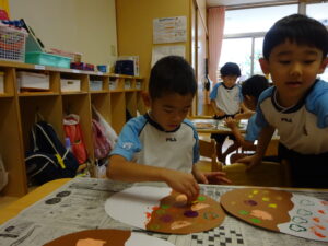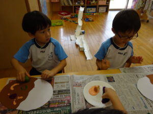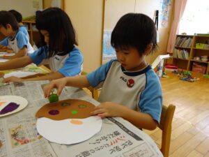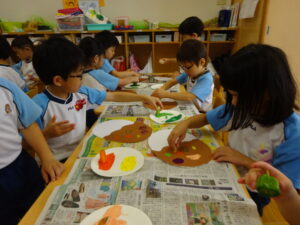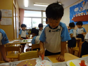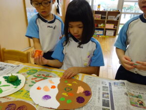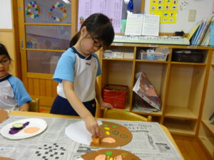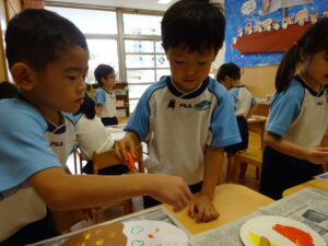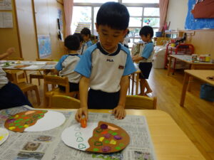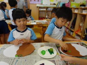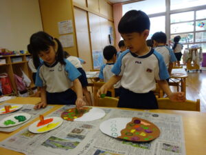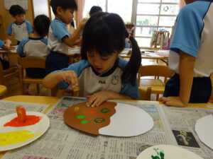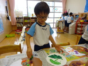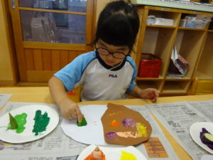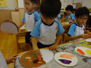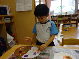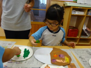 2024.08.17 クッキングの後は…🍛ぞう組 先日、おつカレーパーティーをしたぞう組さん。今度は絵の具でカレーライスの製作をしています。ピーマン、にんじん、オクラなど野菜スタンプを使って具材を表現しています。野菜はいつも見ている形と切った時の形の違いにも気づき、「おもしろいね~」とスタンプをくり返し楽しんでいましたよ。 < 前の記事へ | 次の記事へ >