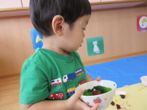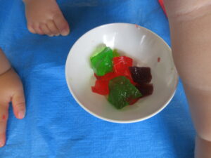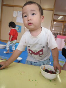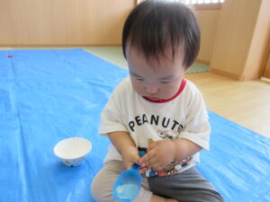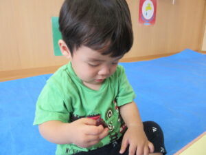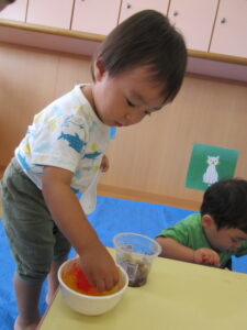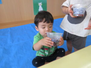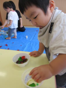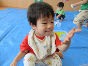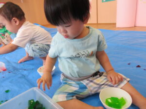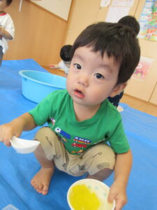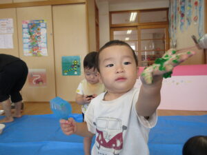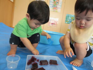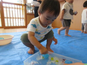 2024.08.13 むにゅむにゅ~、何だろう?☆あひる組 この日は寒天遊び!手でつんつんと触ってみたり、思い切り力を込めて手でにぎってみたり、手の中で崩れていく感触を楽しんだりしていました。「うわぁ~」「なんだろう?」「みてみて~」など…子どもたちは表情豊かに思いを伝えてくれていましたよ。 < 前の記事へ | 次の記事へ >