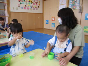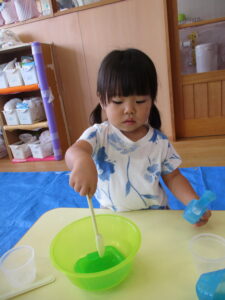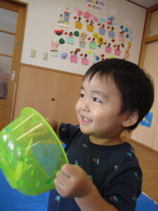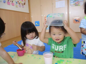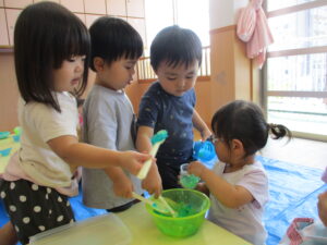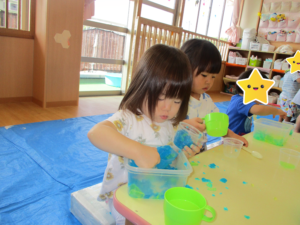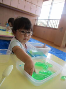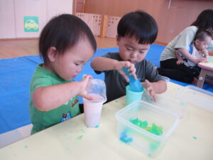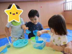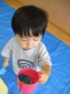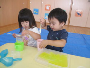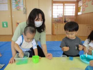 2024.09.07 寒天ぷるぷる~ん☆りす組 りす組さんで初めての寒天遊び。ためらうことなく、手でつかんだり、足でふんでみたり…「ぷるぷる」「ぐちゃぐちゃ」と感触を楽しむ子どもたちでした。手のひらで握るようにしてじっくりと感触を楽しむ姿もありましたよ。カップやコップにいろいろな色の寒天を混ぜて「ゼリー!」や「ジュース」を作る子もいて、たくさん楽しむことができました。 < 前の記事へ | 次の記事へ >