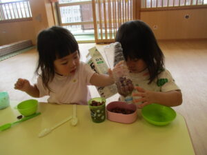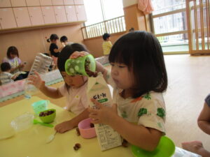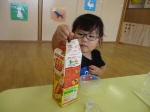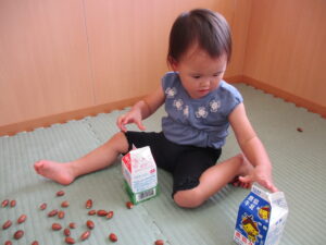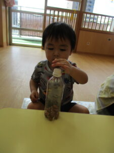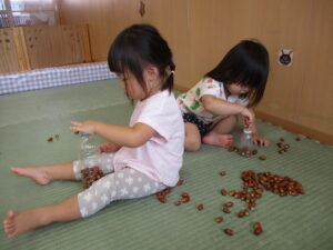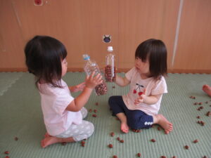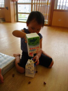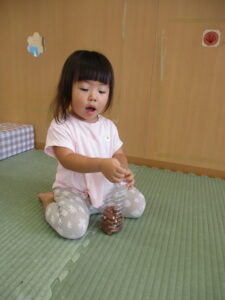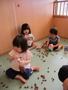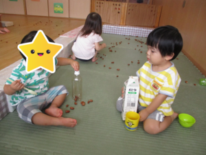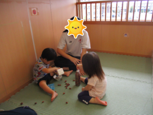 まだまだ外は暑いですが…お部屋ではどんぐり遊び♪ペットボトルや牛乳パックの中にどんぐりをたくさん集めよう!揺らしてみると音がするね!たくさん集めて嬉しいね(^-^)中学生のお姉さんも一緒に遊んでくれて「みてみて~」と集めたどんぐりを見てもらい、嬉しそうな子どもたちでした☆