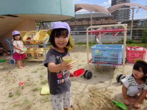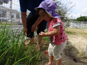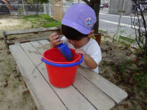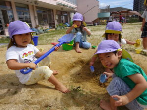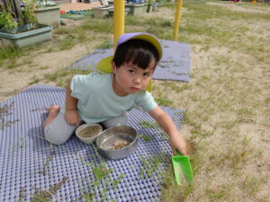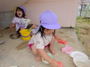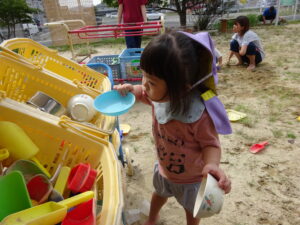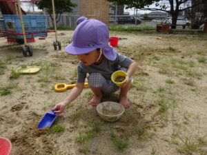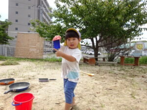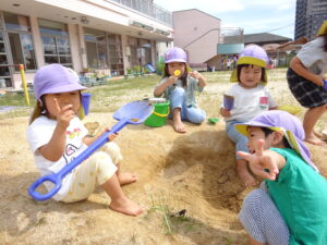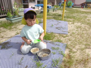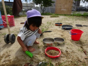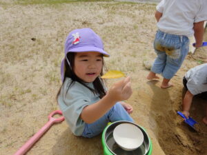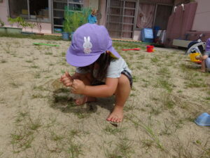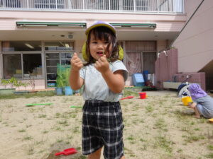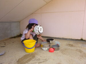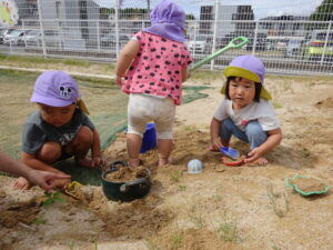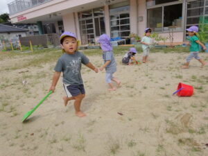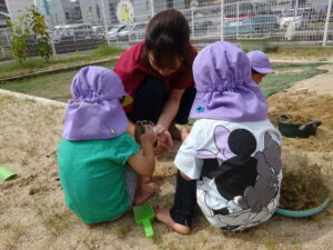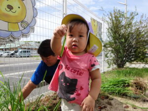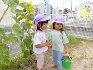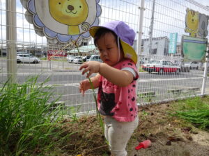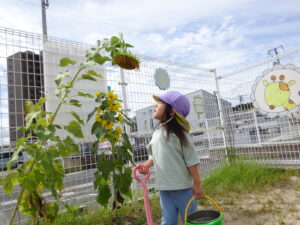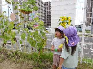 2024.10.02 久しぶりに園庭で遊んだよ♪うさぎ組 厳しい残暑も少しずつ落ち着き、この日は久しぶりに園庭へ遊ぶに出たうさぎ組さん。ひまわりがおじぎしているのを見て「ペコってなってる~」と教えてくれました。時々気持ちの良い風が吹き、秋を感じる瞬間もありました(^-^)これから秋の心地良さを感じながら、外遊びが楽しめそうです♪ < 前の記事へ | 次の記事へ >
