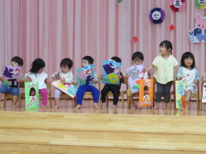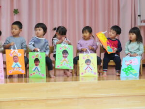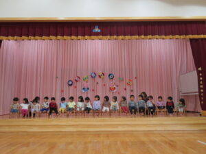 今日はうさぎ組さんのお祝いの日💗遊戯室で七五三お祝い会をしました。1人ずつ名前を呼んでもらいステージの上に出て、椅子に座り、ぞう組のおにいさんおねえさんからプレゼントをもらいました(^-^)こあら・きりん・ぞう組のお友達がおめでとうの気持ちを込めて歌やダンスを披露してくれましたよ。先生たちからのお楽しみでは、たまごの中から…うさぎ組さんのみんなが赤ちゃんだった頃の写真が登場!おおきくなったね~の気持ちをみんなで感じながら楽しい時間を過ごしました。