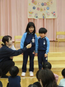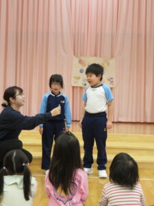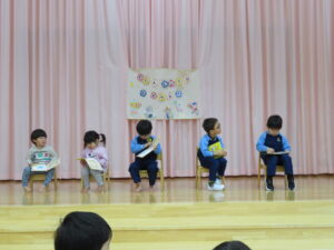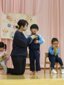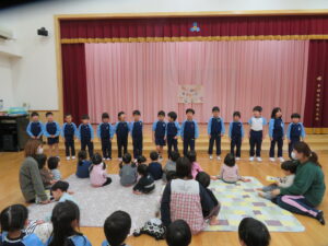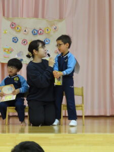 2025.03.19 3月誕生会👑うさぎ・幼児部 「これから誕生会を始めます。」 今月の主役です。 カードのプレゼント✨ 誕生児さんのインタビュー ぞう組さんから歌のプレゼント♪ 先生からのお楽しみ~「ばけたくん👻」 「これで誕生会を終わります。」 3月生まれさん、お誕生日おめでとう👑 < 前の記事へ | 次の記事へ >