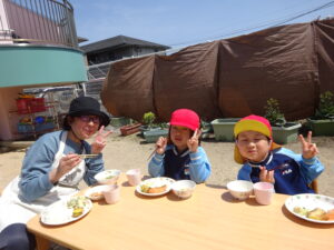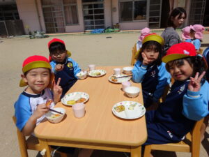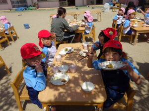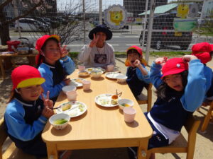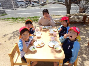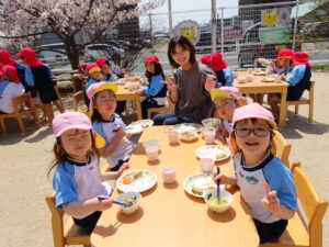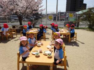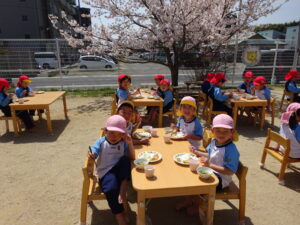 2025.04.14 お花見給食したよ~🌸🦒🐘(4/9) この日はとってもいいお天気!園庭の桜も満開~🌸きりん組、ぞう組さんは園庭でお花見給食をしました。青空の下で食べる給食はいつも以上においしかったようです(^-^) < 前の記事へ | 次の記事へ >