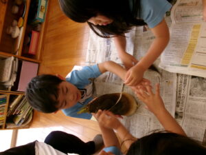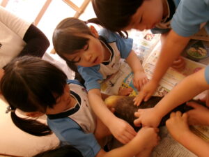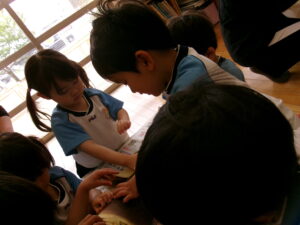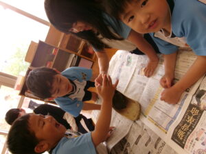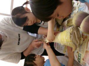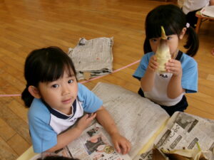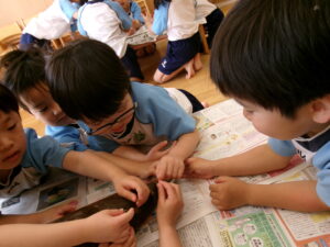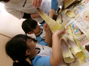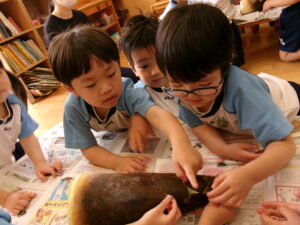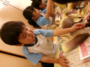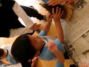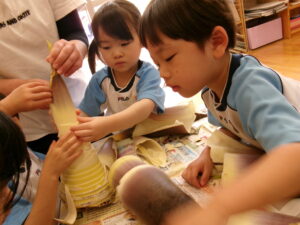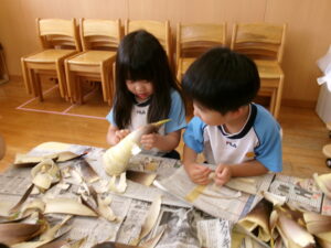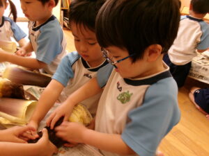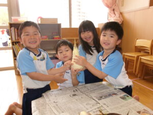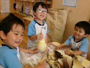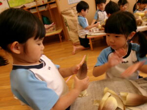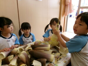 給食先生がお家のお山からたけのこを持ってきてくれました!触ったり、においをかいだりしてから、皮むきをしてみました。たけのこさん、皮がいっぱいだったね。今日のたけのこは給食で食べる予定にしています(^-^)