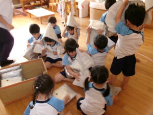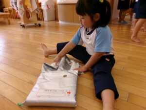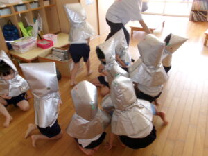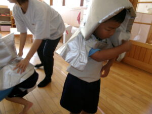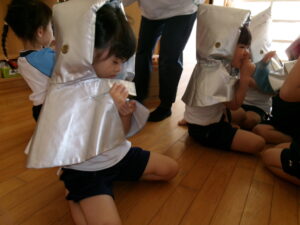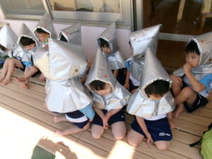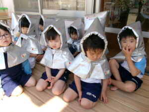 2025.05.01 避難訓練をしました。🦒 この日は避難訓練をしました。給食室からの火災を想定し、テラスへ逃げたり防災頭巾をかぶる練習をしたりしましたよ。静かに集まり、テラスへ避難することができました。 防災頭巾をかぶってみよう! できるかな?? テラスへの避難も上手にできました。 防災頭巾はたたんでしまうよ。 < 前の記事へ | 次の記事へ >