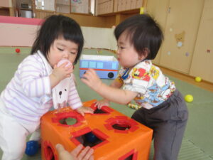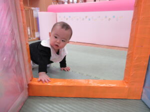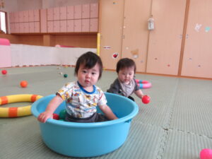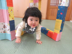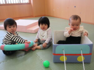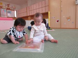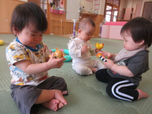 入園から1ヶ月半が経ち、5月に新しいお友達も迎え、少しずつにぎやかになってきたひよこ組さん。先生やお友達と一緒に楽しく過ごしていますよ。天気のいい日は園庭へ出かけ、心地よい春の風を感じたり、砂の感触を楽しんだり、草花に触れたりしながら遊んでいます。お部屋でも色々なものに興味をもち、探索遊びを楽しんでいますよ(^-^)