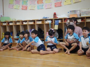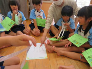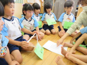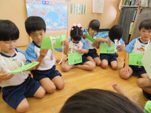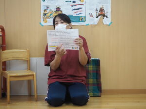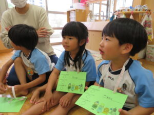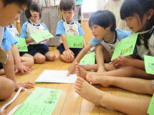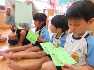 今日はいよいよお楽しみ保育!はじめの会ではスケジュールの確認とお約束の再確認♡今日のお楽しみ保育は「みんなで・なかよく」が合言葉です。そして、ドロシーからの新しいお手紙を見せてもらい、ミッションカードとヒントカードを手がかりに宝探しの始まりです☆