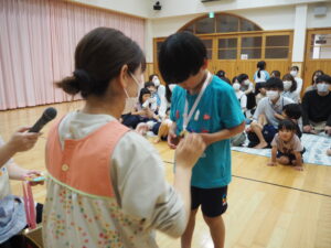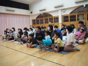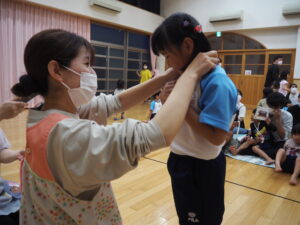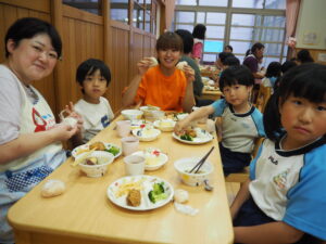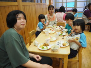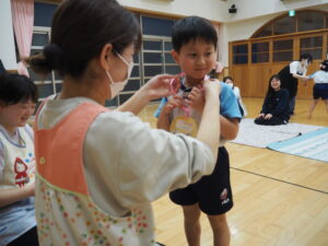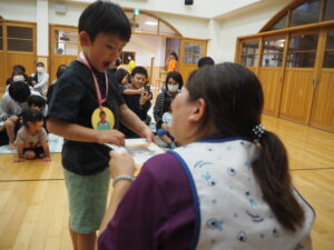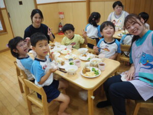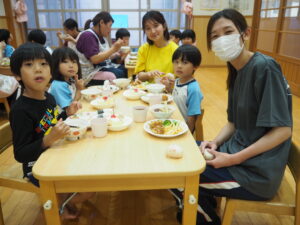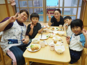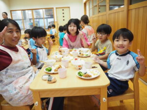「おなかすいた~」と子どもたち。夕食の時間です。自分で好きな味のおにぎりを握って食べました🍙みんなで皮をむいた野菜は給食先生が豚汁にしてくれましたよ。プリンアラモードは「う~ん、おいしい」と最高の笑顔でした(^-^)終わりの会ではお家の方と一緒に今日1日のスライドショーを見て、楽しかった出来事を一生懸命お話していましたね。最後にピカピカメダルと記念写真をもらいました。【みんなで・なかよく】を合言葉にこれからもぞう組さんの仲間と一緒にいろいろなことにやってみようの気持ちで挑戦しましょうね(^-^)