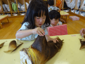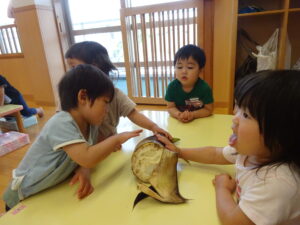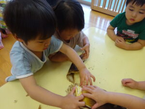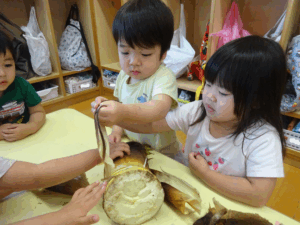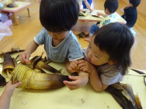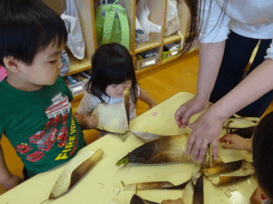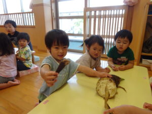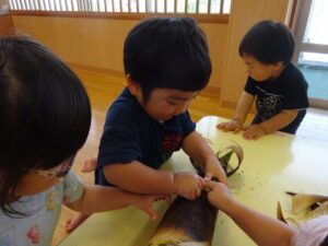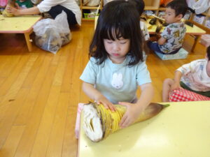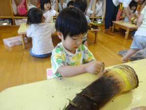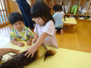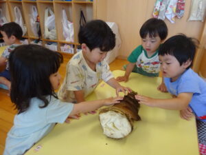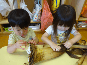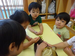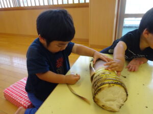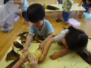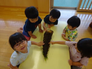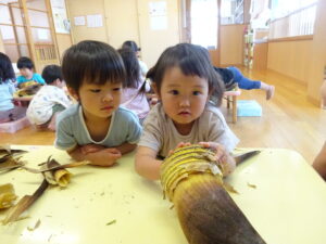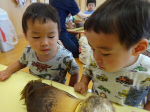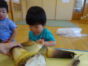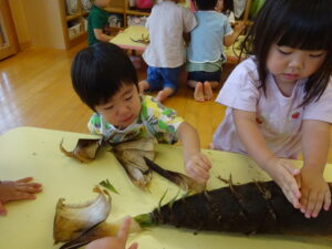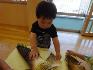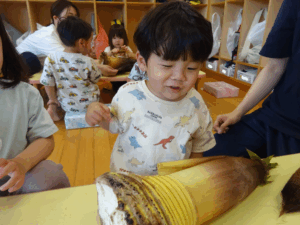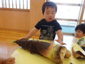 2025.05.28 たけのこさ~ん!🐰 みのり黒田保育園のある先生がお家のお山からたけのこを持ってきてくれました。大きなたけのこだね~。どんなにおいがするかな?さわってみよう!そして…みんなでむきむきしてみよう!たけのこは給食先生がたけのこの唐揚げにしてくれて給食で食べました(^-^) たけのこさんだよ~ さわってみよう! ふわふわしてる? ちょっとざらざらしてる? むきむきしてみよう!! ぎゅーっと力を入れて… < 前の記事へ | 次の記事へ >