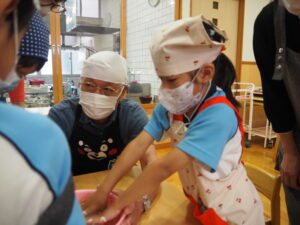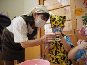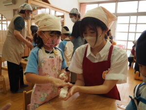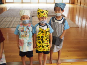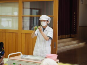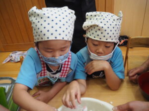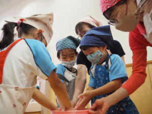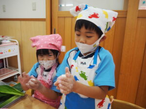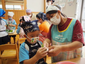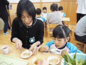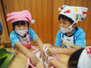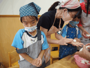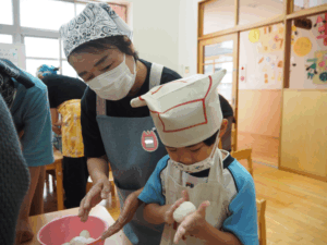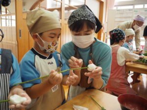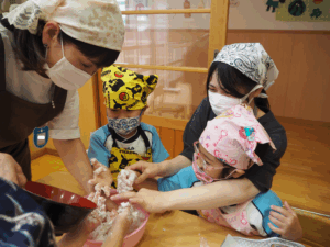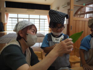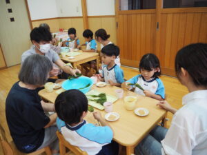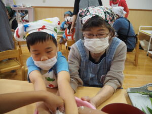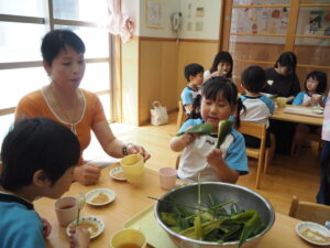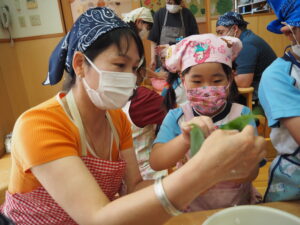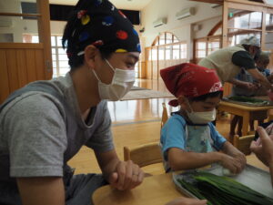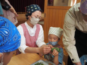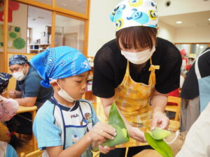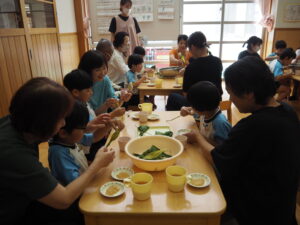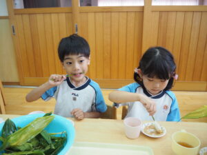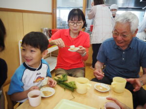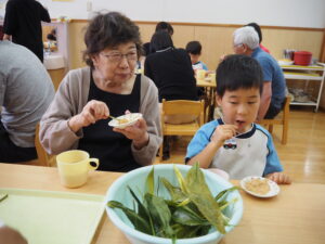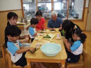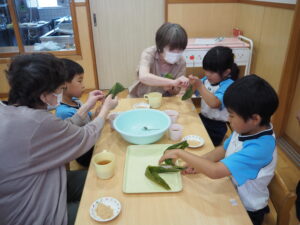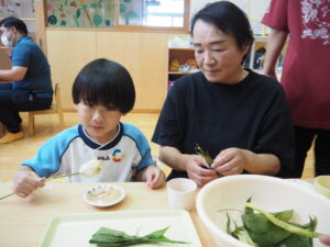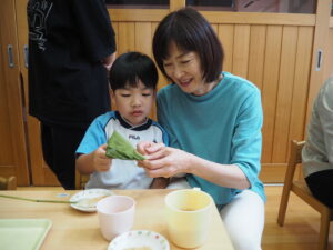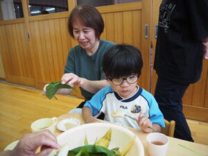 今日は笹巻き会がありました。ぞう組さんが、おじいちゃんおばあちゃんやおうちの方と一緒に笹巻きを作りました。はじめに給食の先生から作り方を教えてもらい、グループに分かれて作り始めました。粉から団子をこねたり、笹で団子を巻いたり、い草で結んだり…少し難しい工程もおじいちゃんおばあちゃんやお家の方と一緒に最後まですることができました。ゆでたての笹巻きを一緒に食べて、楽しい時間を過ごしました(^-^)これからも元気に大きくなってね♡